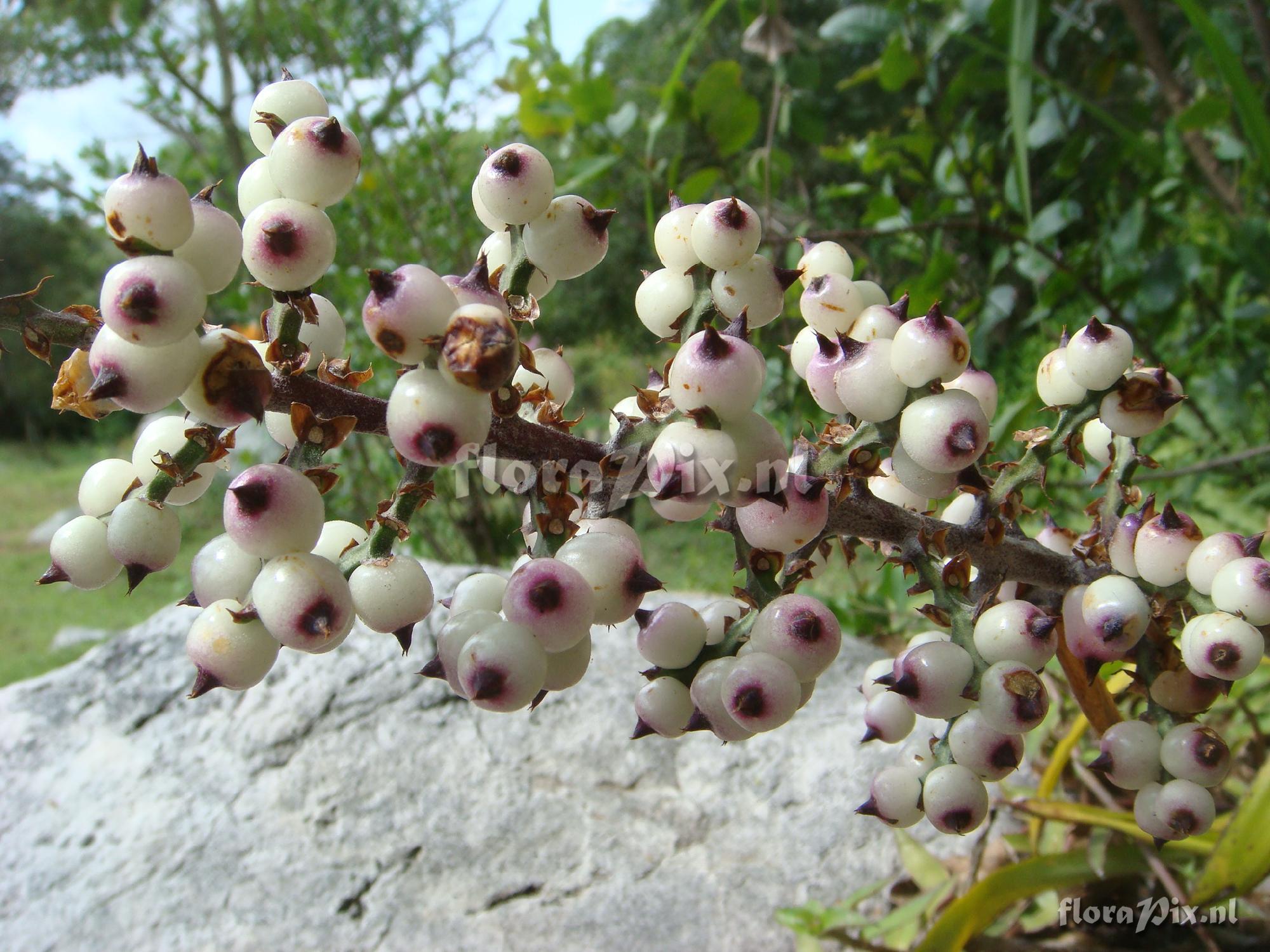 (Geladen als: AECHMEA NN -COLOMBIA) Verzamel locatie: COLOMBIA S.A - Fusagasuga Growing ion a stone in the wild at 1400m Fotograaf: IGNACIO MORENO Opmerking: Inflorescence close up Correction: the berries become dark burgundy (Verzonden: brom-l@nic.surfnet.nl) Determinatie: Opgelost