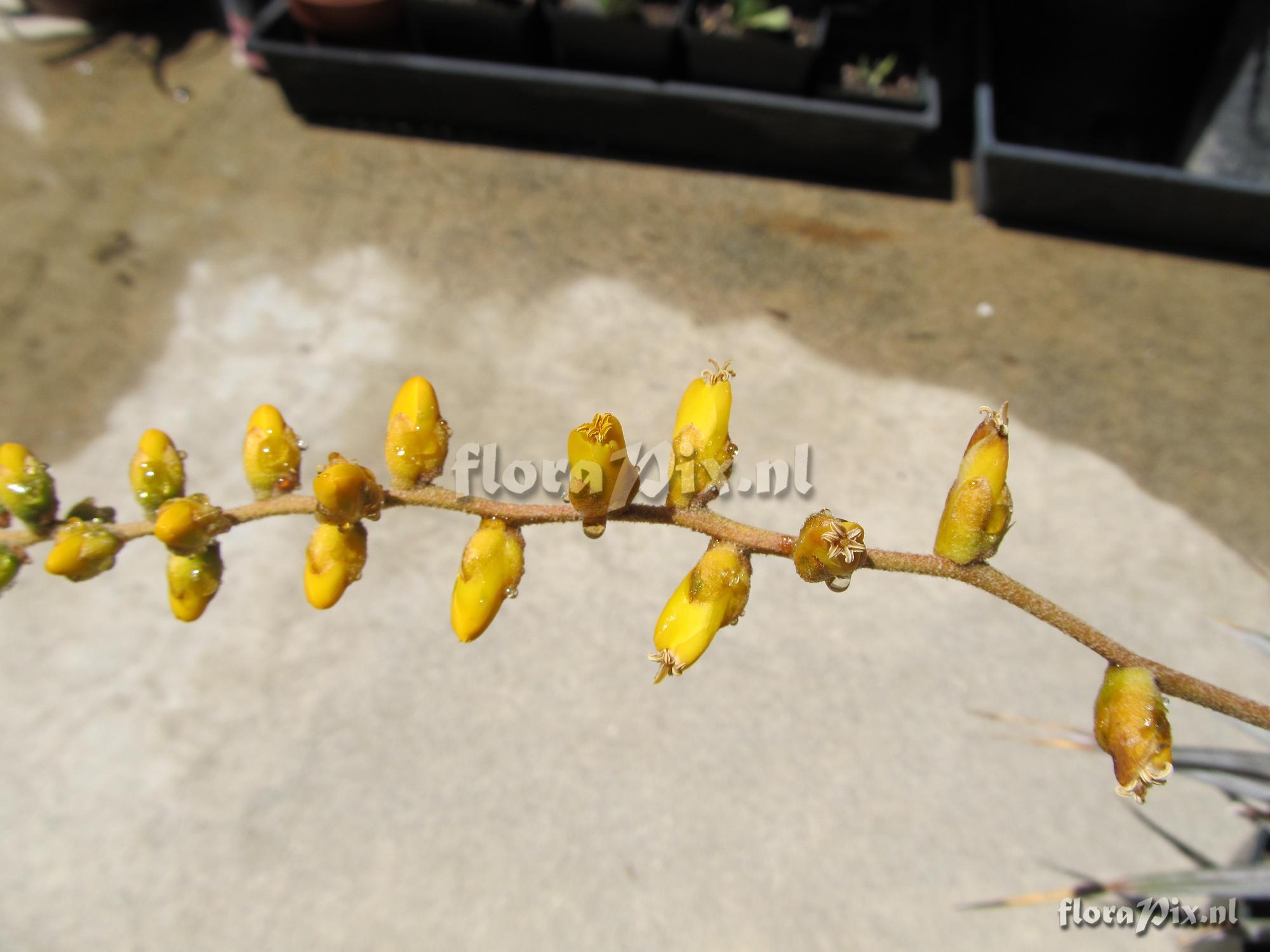- Opmerking (9901): Dutch Vandervort (2012-06-24) - Bryan - this pup into bloom phenomenon is actually somewhat common in many of the terrestrials. The stubby, pup-like 'leaves' are actually succulent scape bracts. Thus bloom is lateral and the apical meristem persists. Again, everything indicates Dyckia. The hunch gets elevated to a solid guess! You might dissect one of the flowers to see if there is anything there that precludes or challenges Dyckia but I think now it is mostly a matter of which Dyckia is it, hybrid? Species? If species, established or new? (Verzonden: brom-l@science.uu.nl)