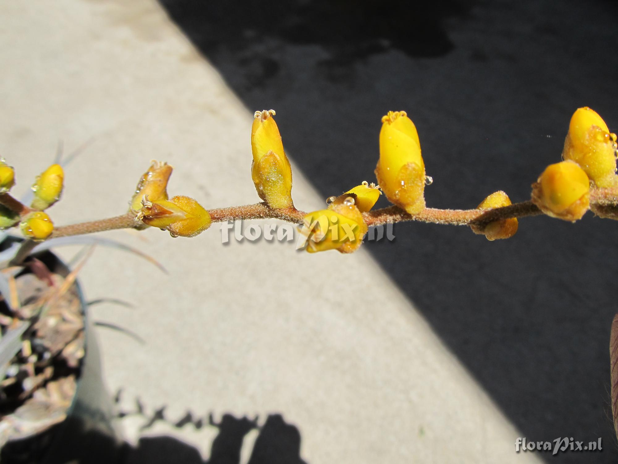 - Opmerking (9901): Dutch Vandervort (2012-06-24) - Bryan - this pup into bloom phenomenon is actually somewhat common in many of the terrestrials. The stubby, pup-like 'leaves' are actually succulent scape bracts. Thus bloom is lateral and the apical meristem persists. Again, everything indicates Dyckia. The hunch gets elevated to a solid guess! You might dissect one of the flowers to see if there is anything there that precludes or challenges Dyckia but I think now it is mostly a matter of which Dyckia is it, hybrid? Species? If species, established or new? (Verzonden: brom-l@science.uu.nl)