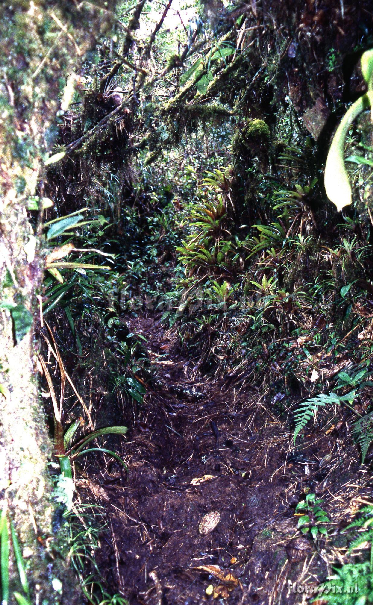 Verzamel locatie: Ecuador - Yangana in Loja Province - 24km South of Yangana in Loja province at about 7800ft altitude. Very wet growing terrestrially in moss. Dark conditions. At first I thought it might be Guzmania mosqueraea, but I don't think so now. Leaves heavily spotted, not striped.
