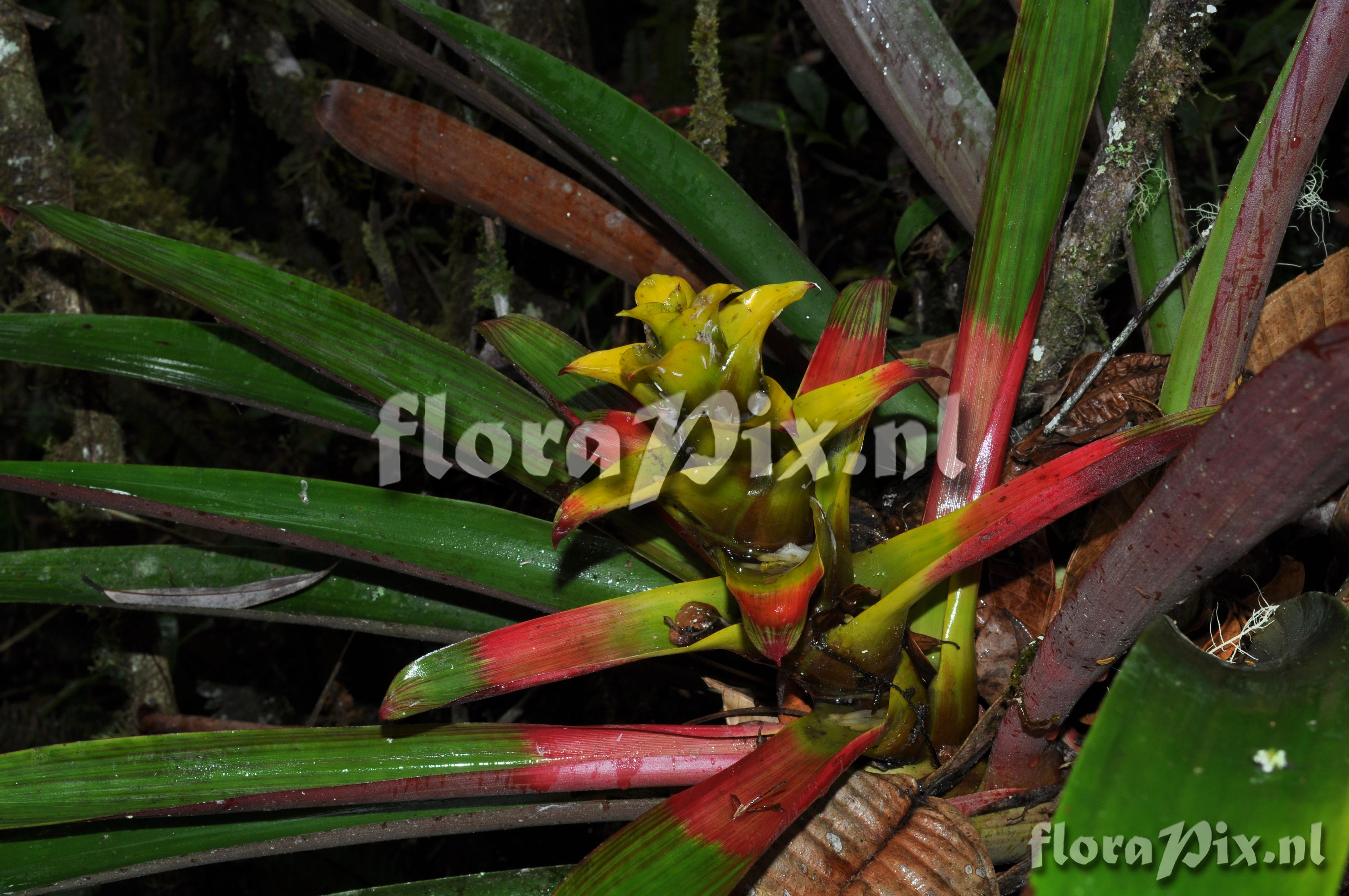 (Geladen als: Guzmania ) Verzamel locatie: Ecuador - Prov. Zamora-Chinchipe; close to Zamora; entrance of Podocarpus NP ""Bombuscaro"", tall premontane moist forest Fotograaf: Florian Werner Opmerking: Col.: Werner, F.A. 3122 (08-04-2011) else often terrestrial in thick raw humus. Rather compact species that grows up into the midstorey. Unmistakable intense red leaf striping even in mature plants. Juveniles in their compactness resembling rather a Tillandsia. Flower-advertising bracts red or, in center, yellow. Determinatie: Opgelost
