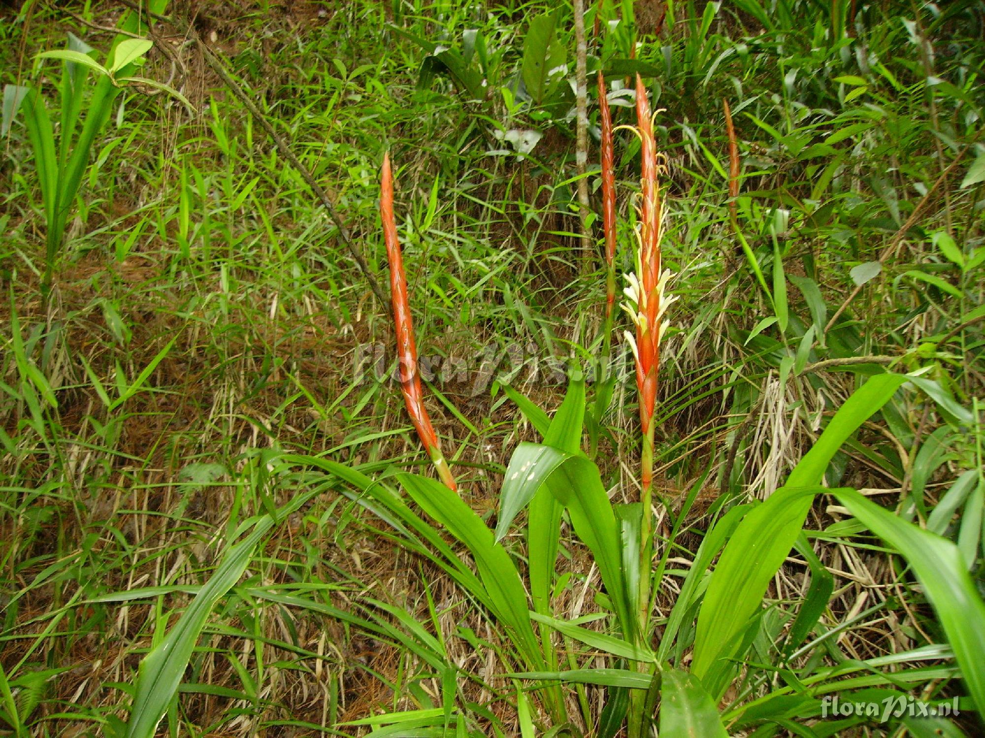 (Geladen als: Tillandsia calderonii) Verzamel locatie: Honduras - Lempira - National Park Celaque Fotograaf: Reino Koopmans Opmerking: Leaves 110 cm long, 6 cm wide, near a river, altitude 1500 meter. (Verzonden: brom-l@science.uu.nl) Determinatie: Opgelost