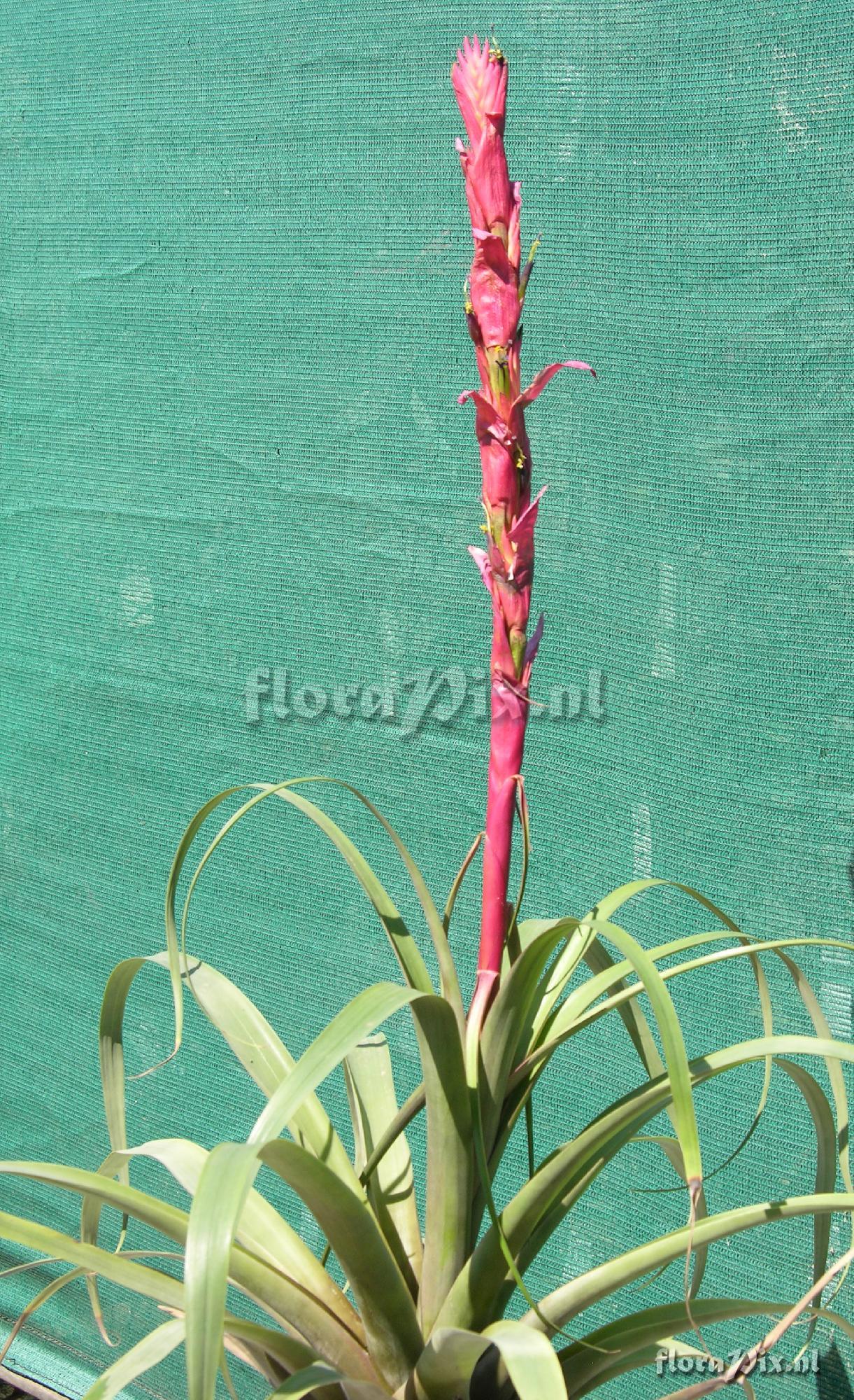 Verzamel locatie: Loja - Ecuador - Yangana, South of Loja Fotograaf: Len Colgan Opmerking: Those who were at Albury nearly four months ago might recall a plant with a forming tall red spike that I had collected in Ecuador. It is a TV, being previously known as Vriesea cylindrica, but now T. porphyrocraspeda. It was the most southerly plant I collected (during the second trip to Ecuador), with its habitat between Loja and the Peruvian border. I promised I would show images when it eventually flowered. Well, at long last it has! Please see the three attached images. For those who were not at Albury, the leaves are grey lepidote and firmish (actually much greyer than they appear in the first image). Notice how the bracts wither before the flowers emerge, as is the case with many species in this group. There will clearly be a lot of flowers. (Verzonden: brom-l@science.uu.nl) Determinatie: in behandeling