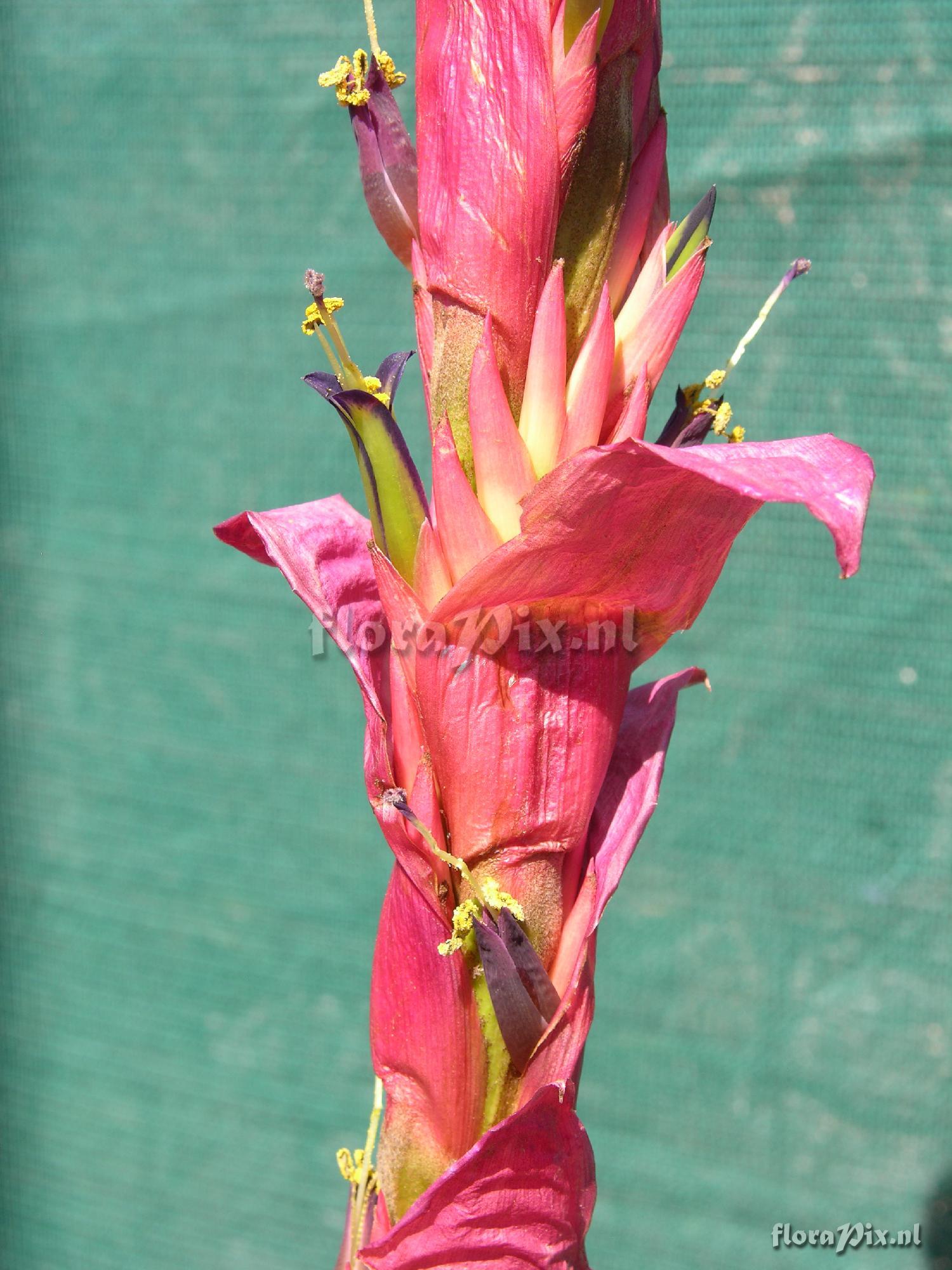 Verzamel locatie: Loja - Ecuador - Yangana, South of Loja Fotograaf: Len Colgan Opmerking: Those who were at Albury nearly four months ago might recall a plant with a forming tall red spike that I had collected in Ecuador. It is a TV, being previously known as Vriesea cylindrica, but now T. porphyrocraspeda. It was the most southerly plant I collected (during the second trip to Ecuador), with its habitat between Loja and the Peruvian border. I promised I would show images when it eventually flowered. Well, at long last it has! Please see the three attached images. For those who were not at Albury, the leaves are grey lepidote and firmish (actually much greyer than they appear in the first image). Notice how the bracts wither before the flowers emerge, as is the case with many species in this group. There will clearly be a lot of flowers. (Verzonden: brom-l@science.uu.nl)