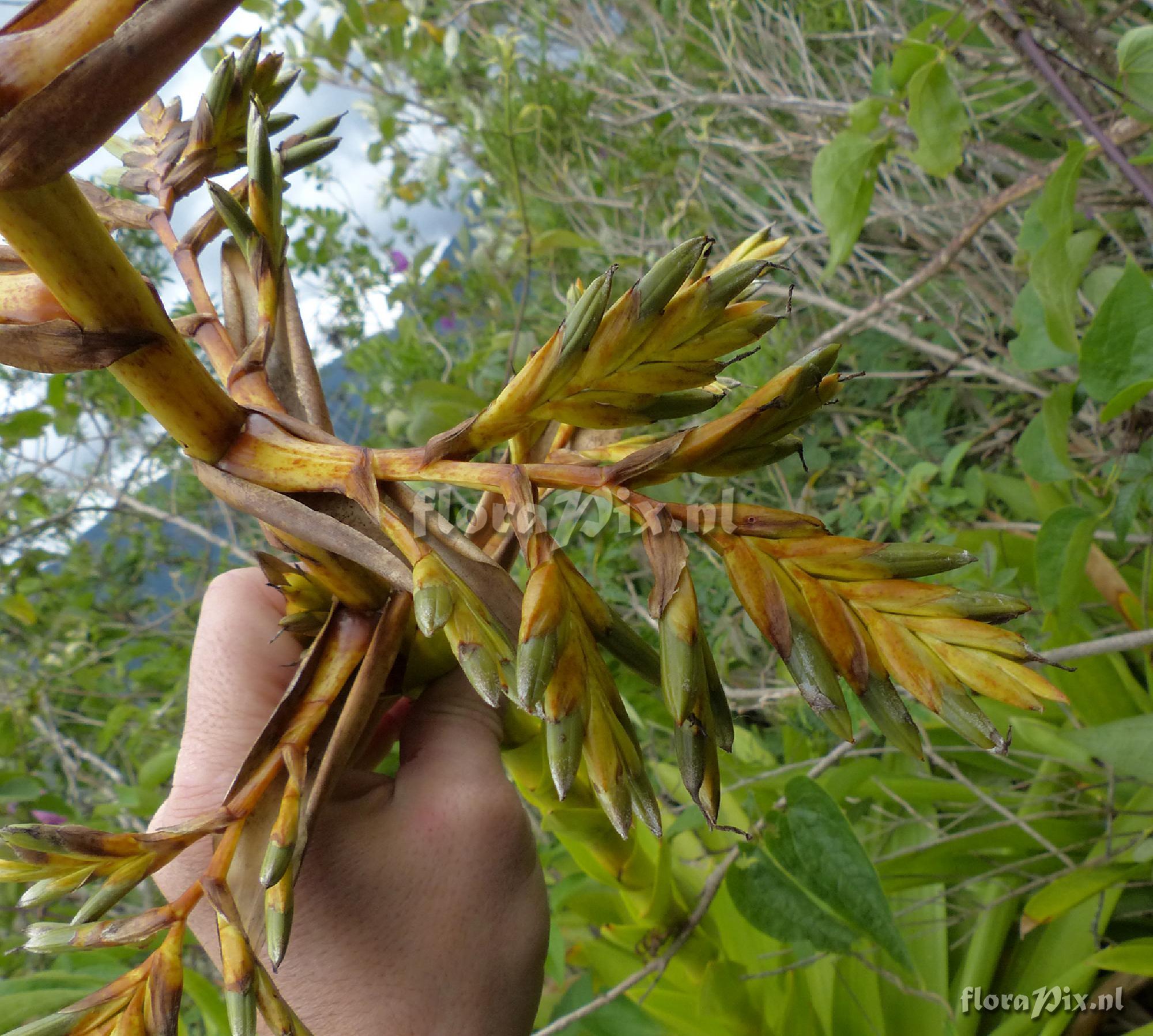 - Opmerking (11886): Jerry Raack (2015-02-17) - I had my guide in-country go back and find this plant again and take some measurements and additional pictures for me. Here is some additional information on the size of this plant. Total height including inflorescence 190cm. Leaves 40cm long by 4 cm wide. Lateral flower spike from main spike 12 to 13cm. I first saw this plant Nov 3, 2015. By Feb 8, all flowers were done, as evidenced by the additional pictures I will post. My guide collected seed pods of this and will send them to me, as well as some small offsets from the flowering plants. (Verzonden: brom-l@science.uu.nl)