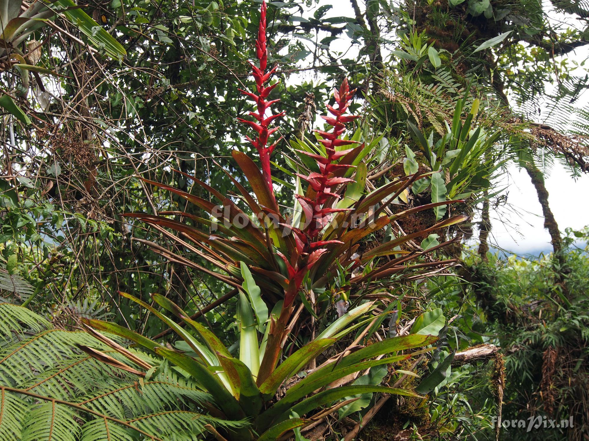 (Geladen als: Vriesea (Mezobromelia) rubrobracteata) Verzamel locatie: Ecuador, Zamora-Chinchipe Province - East on the road from Los Encuentros toward the Condor Mountains. Growing terrestrially amid dense ground-cover ferns and low on trees along the road. Also found on the road from El Pangue to Limon along road cuts. Elevation 1630 meters on both roads. Fotograaf: Jerry Raack Opmerking: Currently in the genus Vriesea, but may belong in Mezobromelia. I consider this to be one of the most beautiful of all bromeliads to be found in this area. It is startingly carmin red. Flowers were not open at the time I saw it in the 3rd week of January. The description in the Bromeliad Encylopedia says this plant grows to 40 cm in height, and the inflorescence has 10 to 12 spikes. But the plants I saw were all much larger than this, and had as many as 30 to 35 spikes on a single inflorescence. Further the Encyclopedia says it grows to 50 cm in diameter, but these plants were closer to 80 cm in diameter. An extra large clone, or is the description inaccurate? (Verzonden: brom-l@science.uu.nl) Determinatie: Opgelost