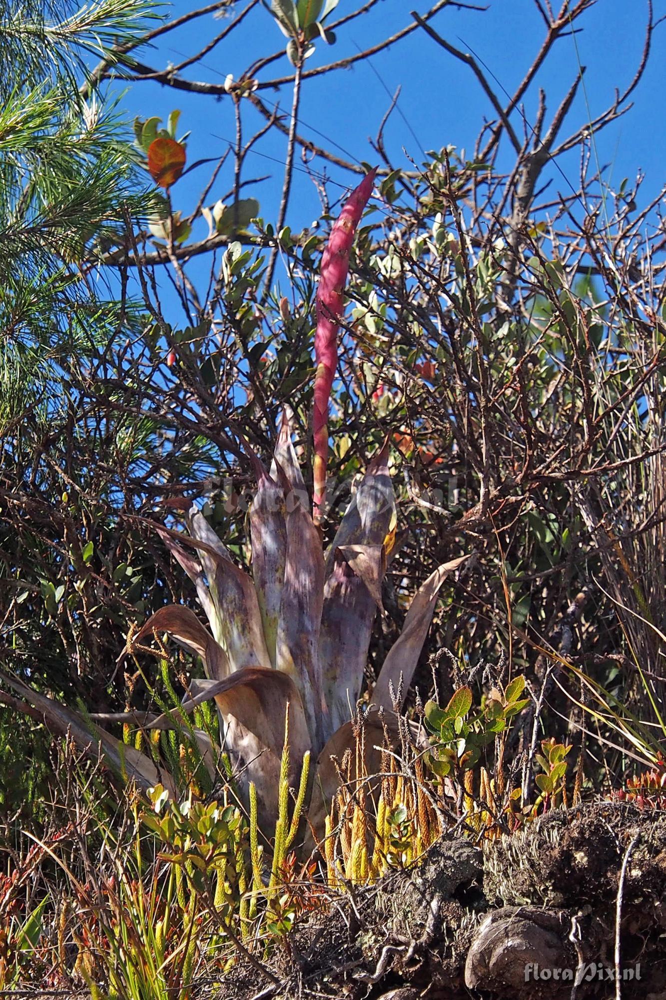 Verzamel locatie: Ecuador, Azuay Province - Rd East from Banos (Cuenca) toward Cajais National Park at an elevation of 2941 meters. Also before this at an elevation of 2658 meters, and finally several times later in the trip in Loja Province at an elevation of 3137 meters. Fotograaf: Jerry Raack Opmerking: This 3rd picture is from high elevation in a dry valley just west of La Paz at 3137 meters. Note how dried the tips of the leaves are, yet it has a beautiful bloom. The actual blooming plant in picture 1 is also very dried out and in bad shape. The offsets from it are the plants that are the nice bright green color.