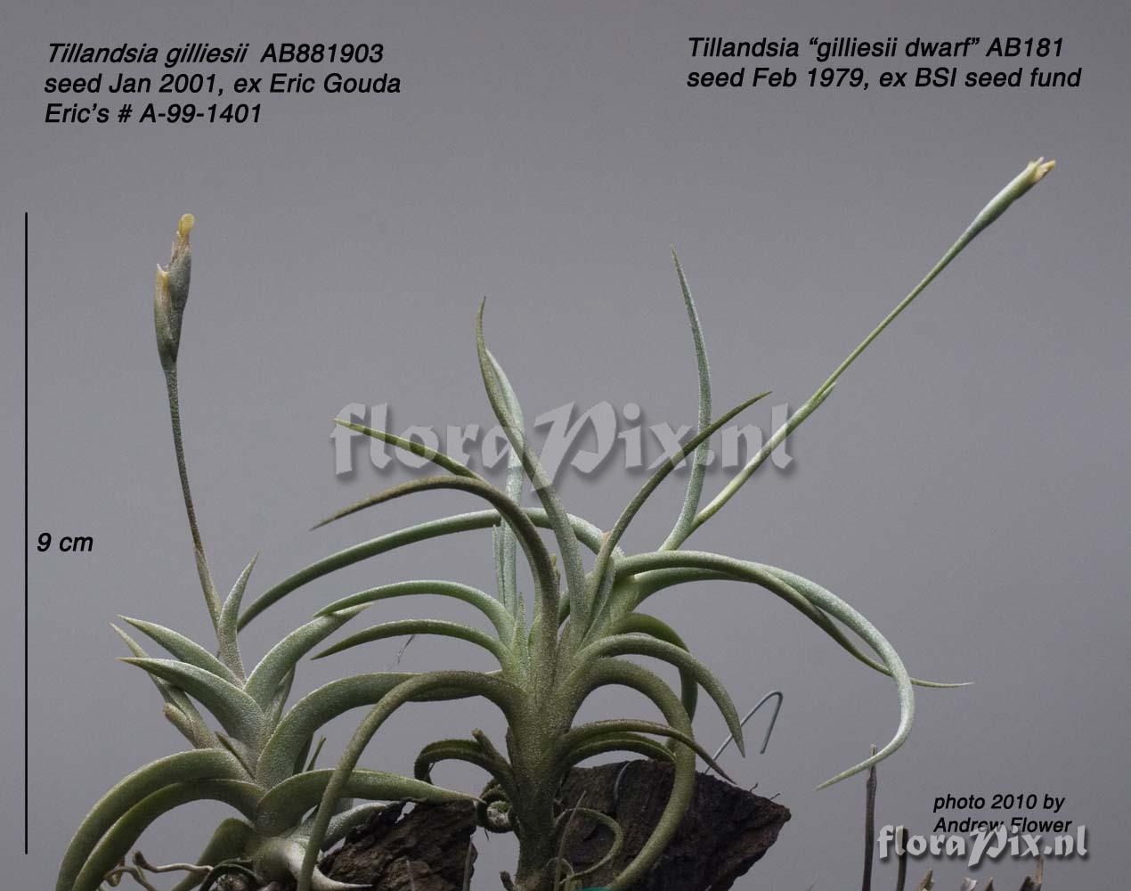 (Geladen als: Tillandsia "gilliesii dwarf") Fotograaf: Andrew Flower Opmerking: Plants orig. grown from seed in 1979, ex BSI seed bank labelled "gilliesii dwarf". Shown here alongside plant ex Eric Gouda in 2001 labelled "Tillandsia gilliesii A-99-1401" The "gilliesii dwarf" populations breed true from seed. (Verzonden: brom-l@nic.surfnet.nl) Determinatie: Opgelost