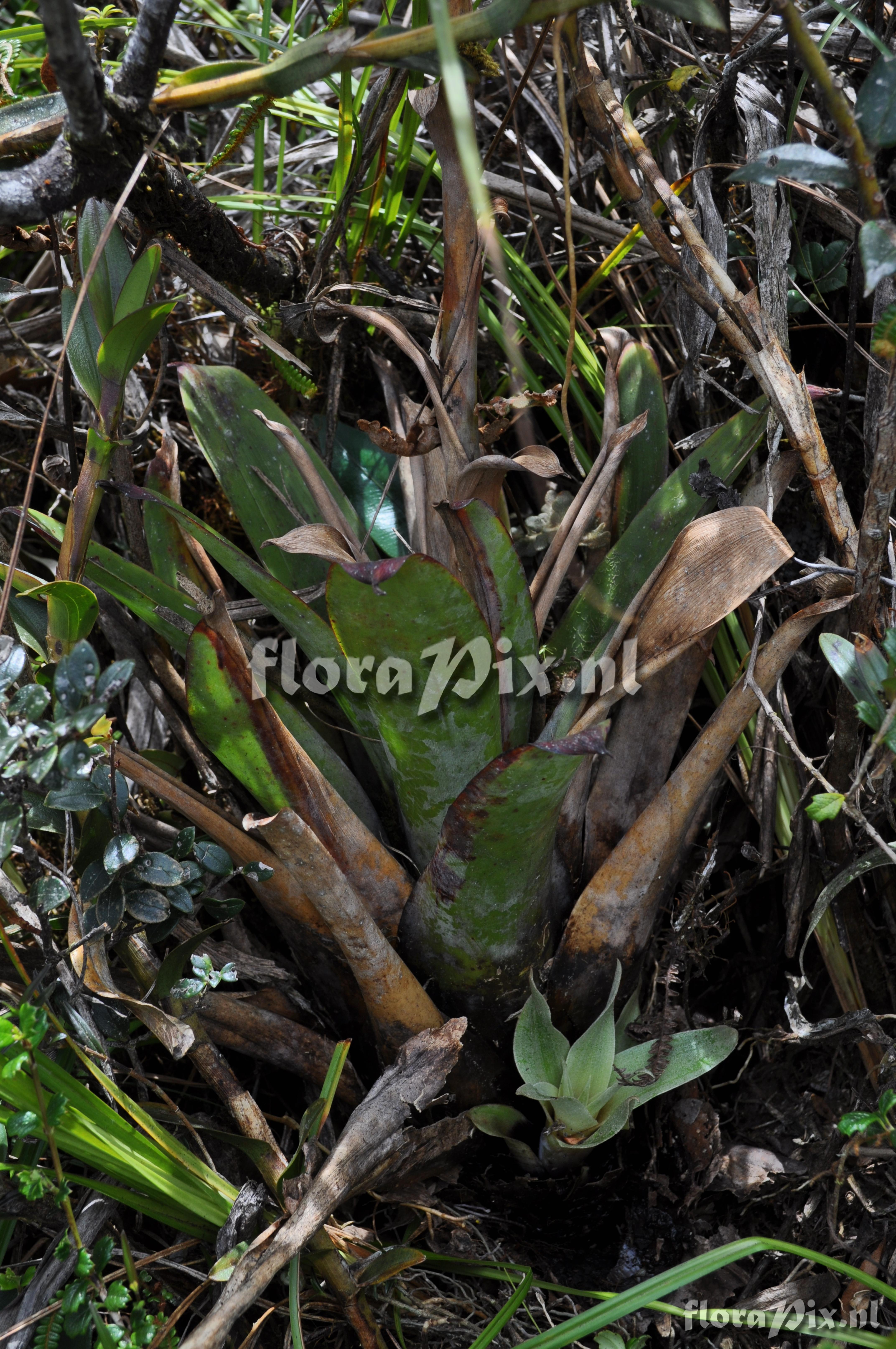 Verzamel locatie: Ecuador - Prov. of Zamora-Chinchipe, area of Estación Cientifica San Francisco (S 03°58´, W 79°04´ ), road Loja-Zamora, ca. 35 km from Loja; moist montane forest Fotograaf: Florian Werner Opmerking: Col.: Werner, F.A. 3115 (13-03-2011) "vegetatively a faint resemblance of T. fendleri but more erect, compact tank; blackish base of outer leaves, the glabrous abaxial leaf side also with conspicuous wax ; flower bracts compact, red, corolla light violet. Epiph. or terrestrial (in paramo)."
