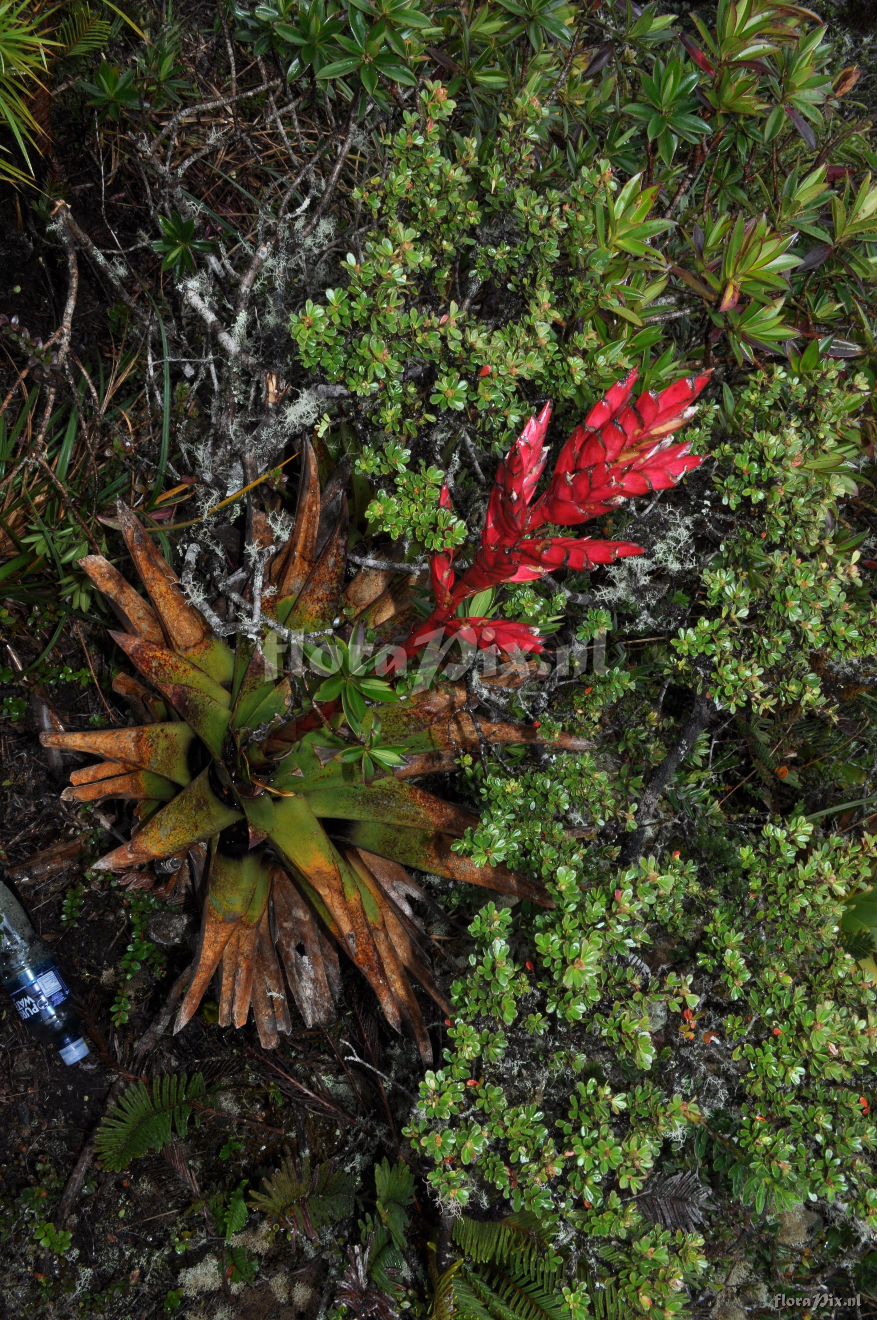Verzamel locatie: Ecuador - Province of Loja, Parque Nacional Podocarpus, Cajanuma Fotograaf: Florian Werner Opmerking: Col.: Werner, F.A. 3123 (09-04-2011) - Det.: F.A. Werner plant terrestrial, but more commonly seen epiphytic. Deep, high storage-capacity- tank. Leaves consp. waxy abaxially, tips spiky-acute. Pedicel & bracts intense purplish dark red, flowers purple apparently (según Nelson). CF. fw3115!