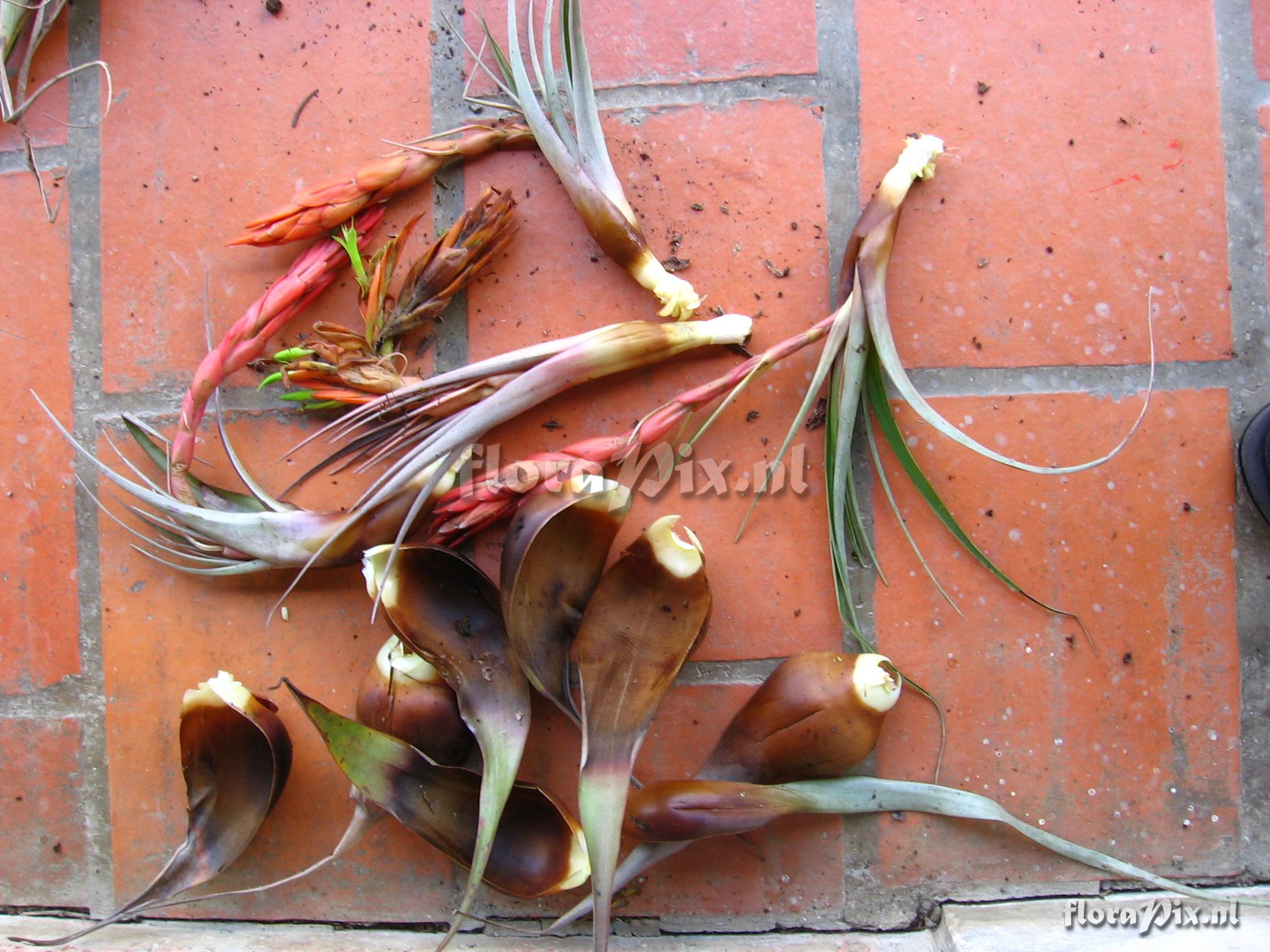 Verzamel locatie: Ecuador - Prov. of Zamora-Chinchipe, area of Estación Cientifica San Francisco (S 03°58“, W 79°04“ ), road Loja-Zamora, ca. 35 km from Loja; moist montane forest Fotograaf: Florian Werner Opmerking: Col.: Werner, F.A. 1962 (23-04-2006) - Det.: H. Luther (SEL) 2007 "greyish type; infl. pending: bracts bright light orange, petals apple-green. Leaves full of trichomes which adaxially in the basal (""tank"")-half are hairy and brown.; strong fibres in leaves."