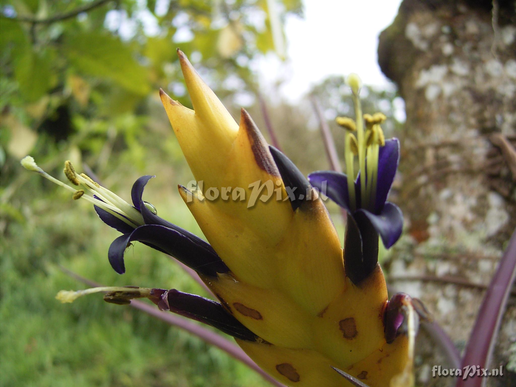 Verzamel locatie: Ecuador - Prov. of Zamora-Chinchipe, area of Estación Cientifica San Francisco (S 03°58“, W 79°04“ ), road Loja-Zamora, ca. 35 km from Loja; moist montane forest Fotograaf: Florian Werner Opmerking: Col.: Werner, F.A. 1762 (08-09-2005) - Det.: H. Luther (SEL) 2007 "leaves fairly red; flower bracts bright yellow; flowering in cult. 11.10.: corolla anthracit."