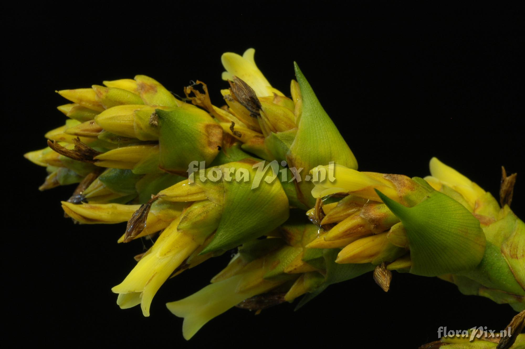 - Add Note (12208): Matthias Asmuss (2015-05-21) - G. weberbaueri has reddish primary and scape bracts with the typical longitudinal lines of a Guzmania. Here I just see yellowish green bracts. I have seen and photographed G. sphaeroidea and it has totally white flowers, whereas this plant has yellow flowers. I did not have an encounter with G. virescens but comparing to Oliva-Esteves' picture in one of his books G. virescens seems to be still the closest match. (Sent: brom-l@science.uu.nl)