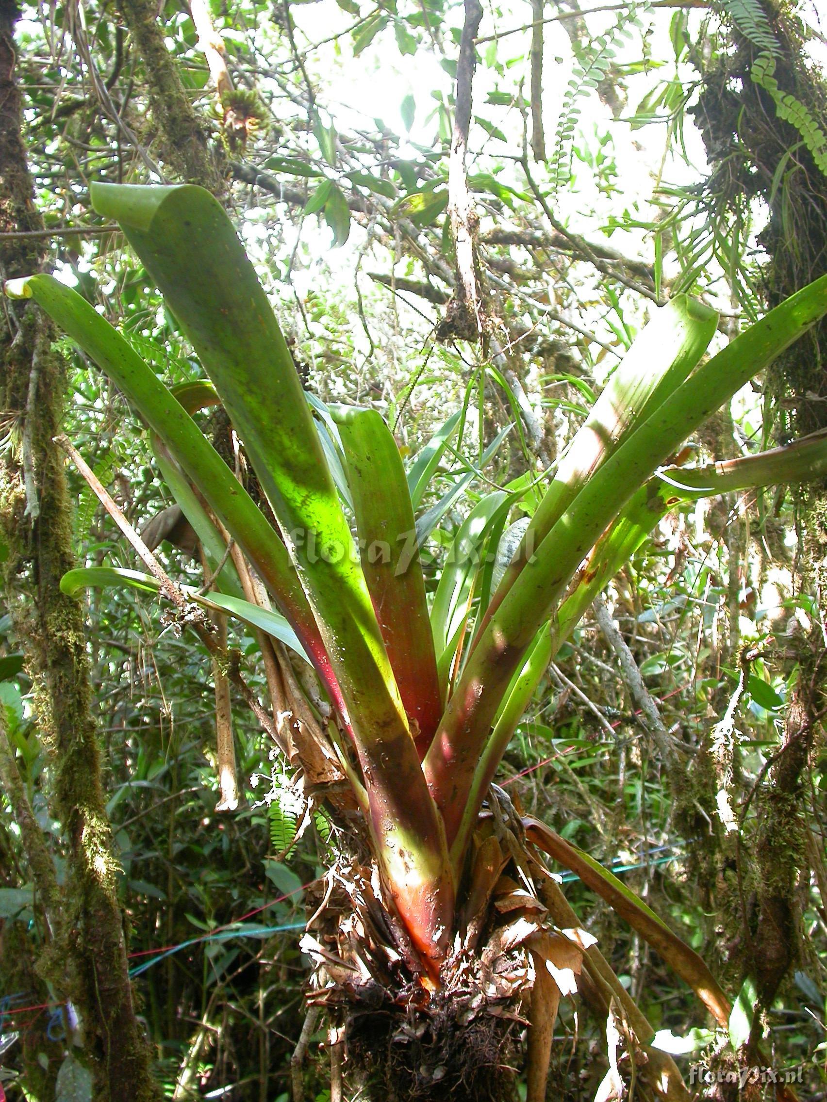 Locality: Ecuador - Prov. of Zamora-Chinchipe, area of Estación Cientifica San Francisco (S 03°58“, W 79°04“ ), road Loja-Zamora, ca. 35 km from Loja; moist montane forest Photographer: Florian Werner Note: Col.: Werner, F.A. 2829 (14-12-2009) "peculiar purplish red leaf pigmentation; gestalt of a Guzmania; leaf tips rolled down in a peculiar way. Who is this?"