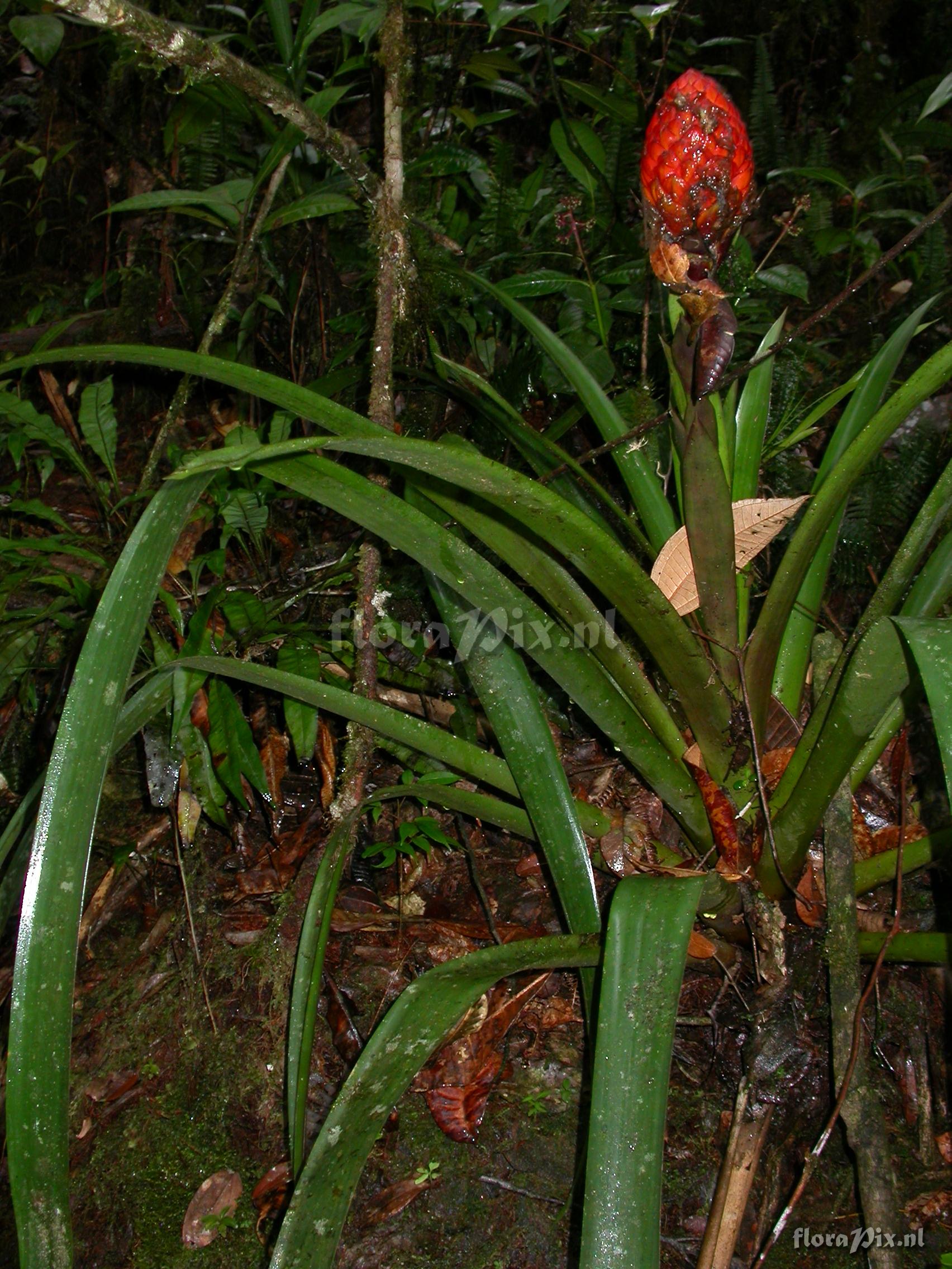 (Uploaded as: Guzmania ) Locality: Ecuador - Prov. Zamora-Chinchipe; close to Zamora; entrance of Podocarpus NP ""Bombuscaro"", tall premontane moist forest Photographer: Florian Werner Note: Col.: Werner, F.A. 3120 (08-04-2011) The bright glossy brich-red bracts forming a pine-cone-like struxcture filled with gue. Petars mild yellow. Identification: solved