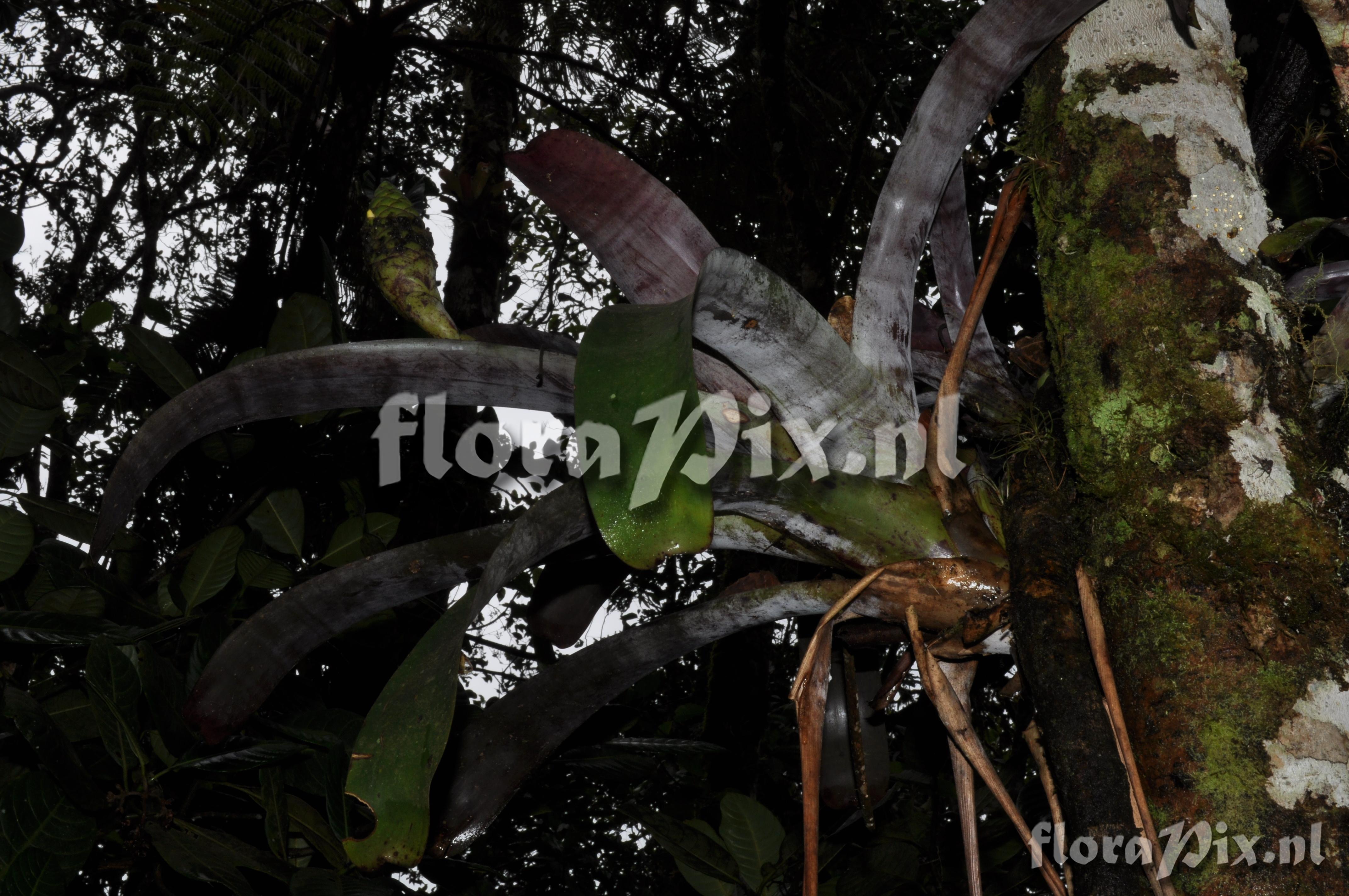 (Uploaded as: Guzmania ) Locality: Ecuador - Prov. of Zamora-Chinchipe, area of Estación Cientifica San Francisco (S 03°58“, W 79°04“ ), road Loja-Zamora, ca. 35 km from Loja; moist montane forest Photographer: Florian Werner Note: Col.: Werner, F.A. 3129 (10-04-2011) flowers white. Plants usually tilted, inflorescence erect. Identification: solved