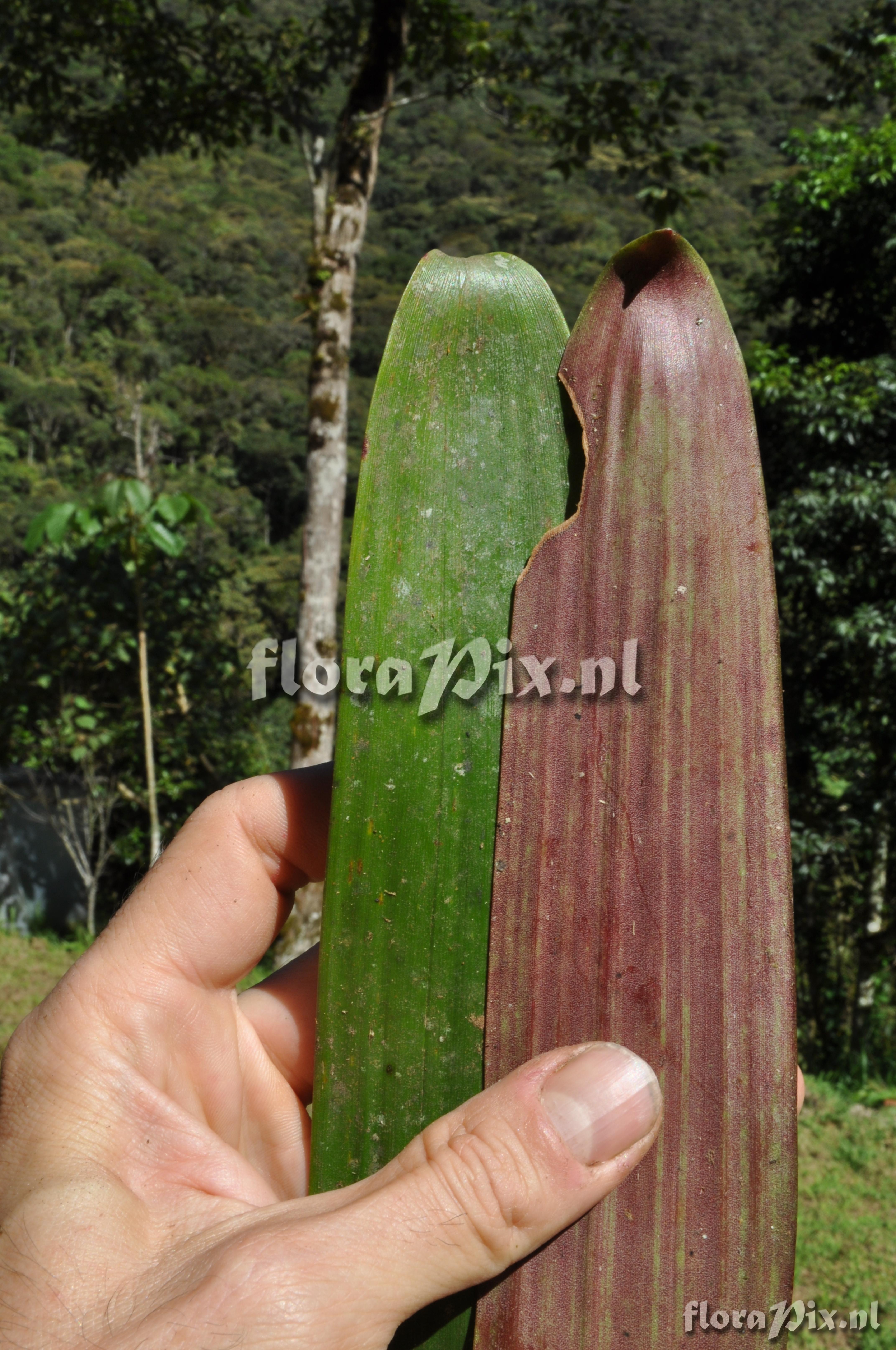 (Uploaded as: Guzmania ) Locality: Ecuador - Prov. Zamora-Chinchipe; close to Zamora; entrance of Podocarpus NP ""Bombuscaro"", tall premontane moist forest Photographer: Florian Werner Note: Col.: Werner, F.A. 3122 (08-04-2011) else often terrestrial in thick raw humus. Rather compact species that grows up into the midstorey. Unmistakable intense red leaf striping even in mature plants. Juveniles in their compactness resembling rather a Tillandsia. Flower-advertising bracts red or, in center, yellow. Identification: solved