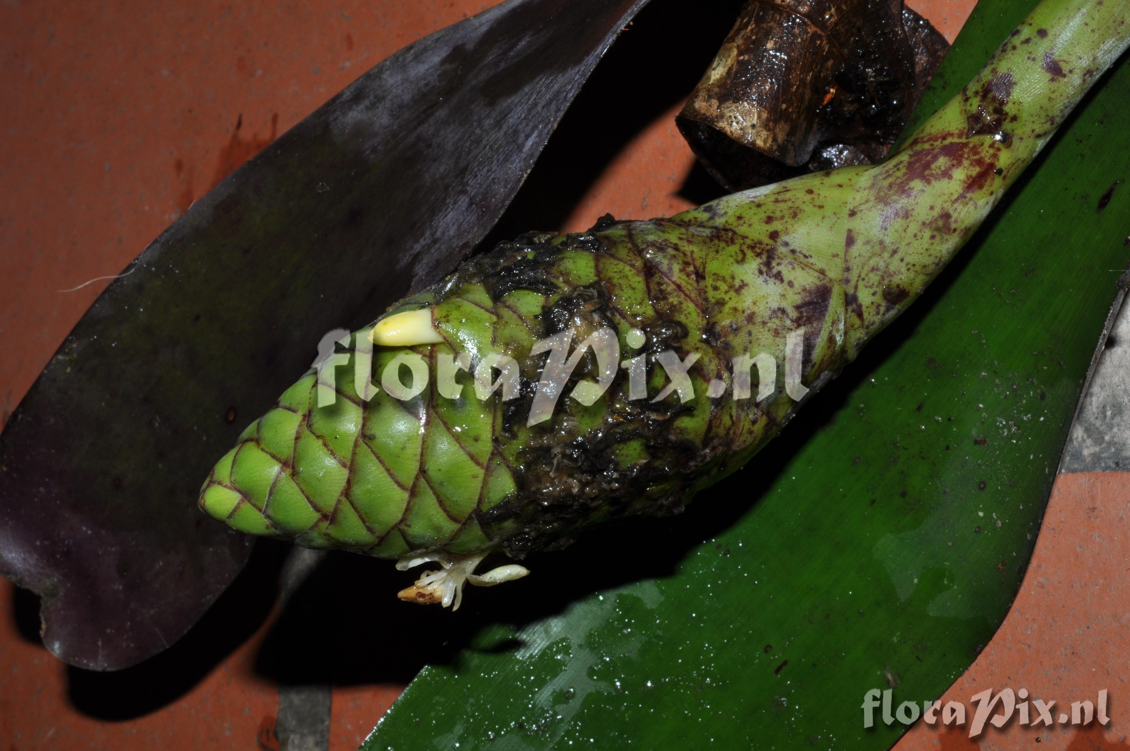 (Uploaded as: Guzmania ) Locality: Ecuador - Prov. of Zamora-Chinchipe, area of Estación Cientifica San Francisco (S 03°58“, W 79°04“ ), road Loja-Zamora, ca. 35 km from Loja; moist montane forest Photographer: Florian Werner Note: Col.: Werner, F.A. 3129 (10-04-2011) flowers white. Plants usually tilted, inflorescence erect. Identification: solved