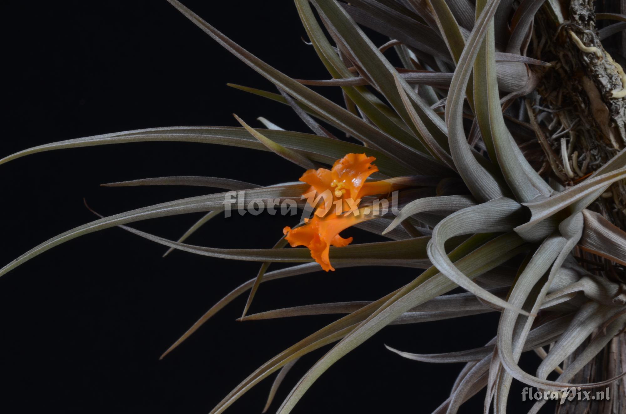 Photographer: Eric Gouda Note: Ik ben al enige tijd bezig Tillandsia's die lange tijd niet gebloeid hebben, in bloei te helpen door middel van een appel. Zo ook deze zaailingen van Tillandsia ericii, die ik ooit van Holm heb gekocht. De grootste plant heb ik van de zomer een week in een plastic zak met een appel gestopt waarna al snel duidelijk werd dat deze ging bloeien door dat hij verkleurde en een bloeiwijze begon te vormen. De eerste bloei is natuurlijk nooit zo spectaculair als het kan zijn, maar de kleur liegt er niet om. Een soort die nog niet zo bekend is, maar naar mijn idee wel een van de mooiste soorten! (Sent: bromelia-l@science.uu.nl) Identification: pending