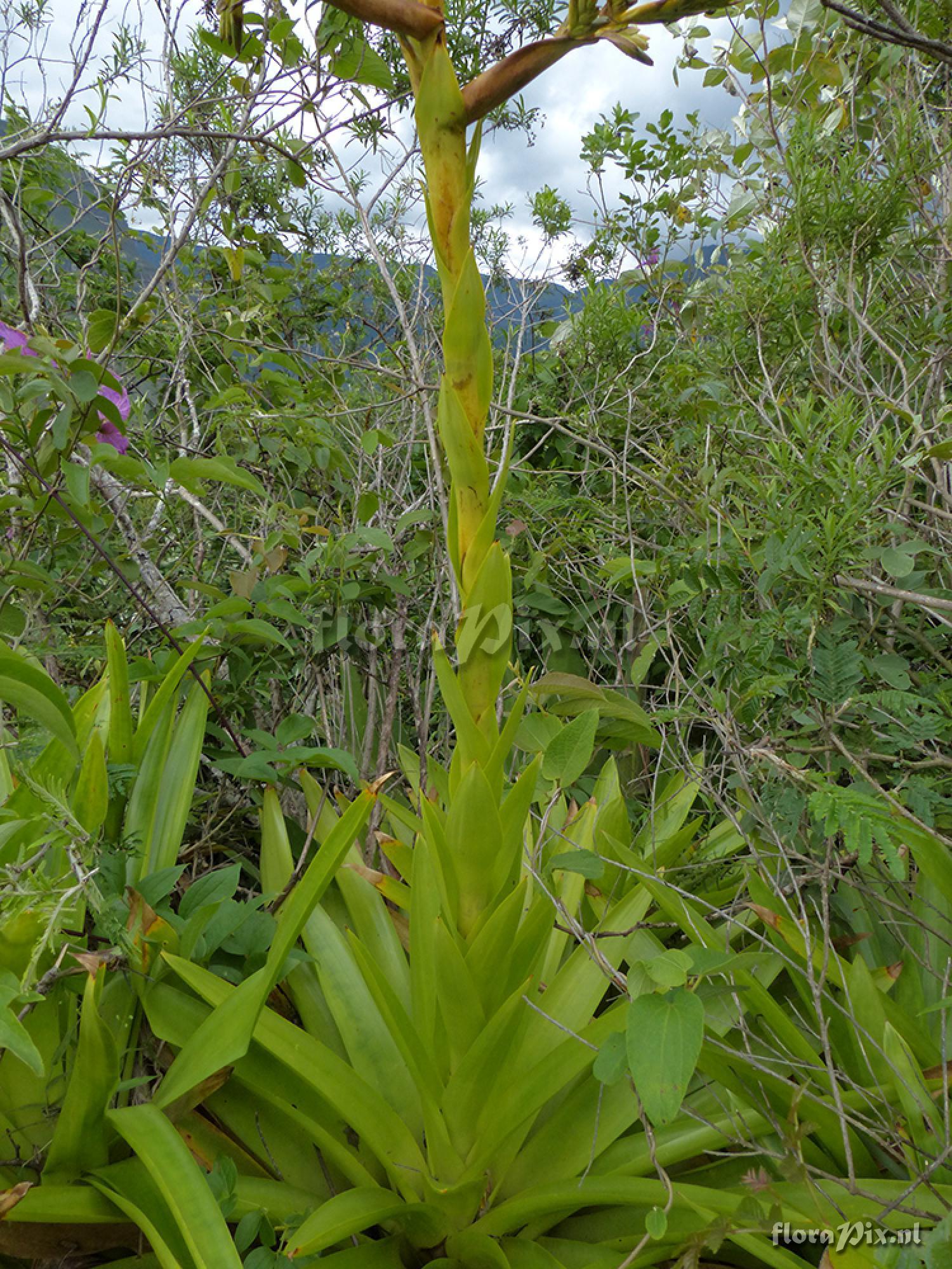 - Add Note (11886): Jerry Raack (2015-02-17) - I had my guide in-country go back and find this plant again and take some measurements and additional pictures for me. Here is some additional information on the size of this plant. Total height including inflorescence 190cm. Leaves 40cm long by 4 cm wide. Lateral flower spike from main spike 12 to 13cm. I first saw this plant Nov 3, 2015. By Feb 8, all flowers were done, as evidenced by the additional pictures I will post. My guide collected seed pods of this and will send them to me, as well as some small offsets from the flowering plants. (Sent: brom-l@science.uu.nl)