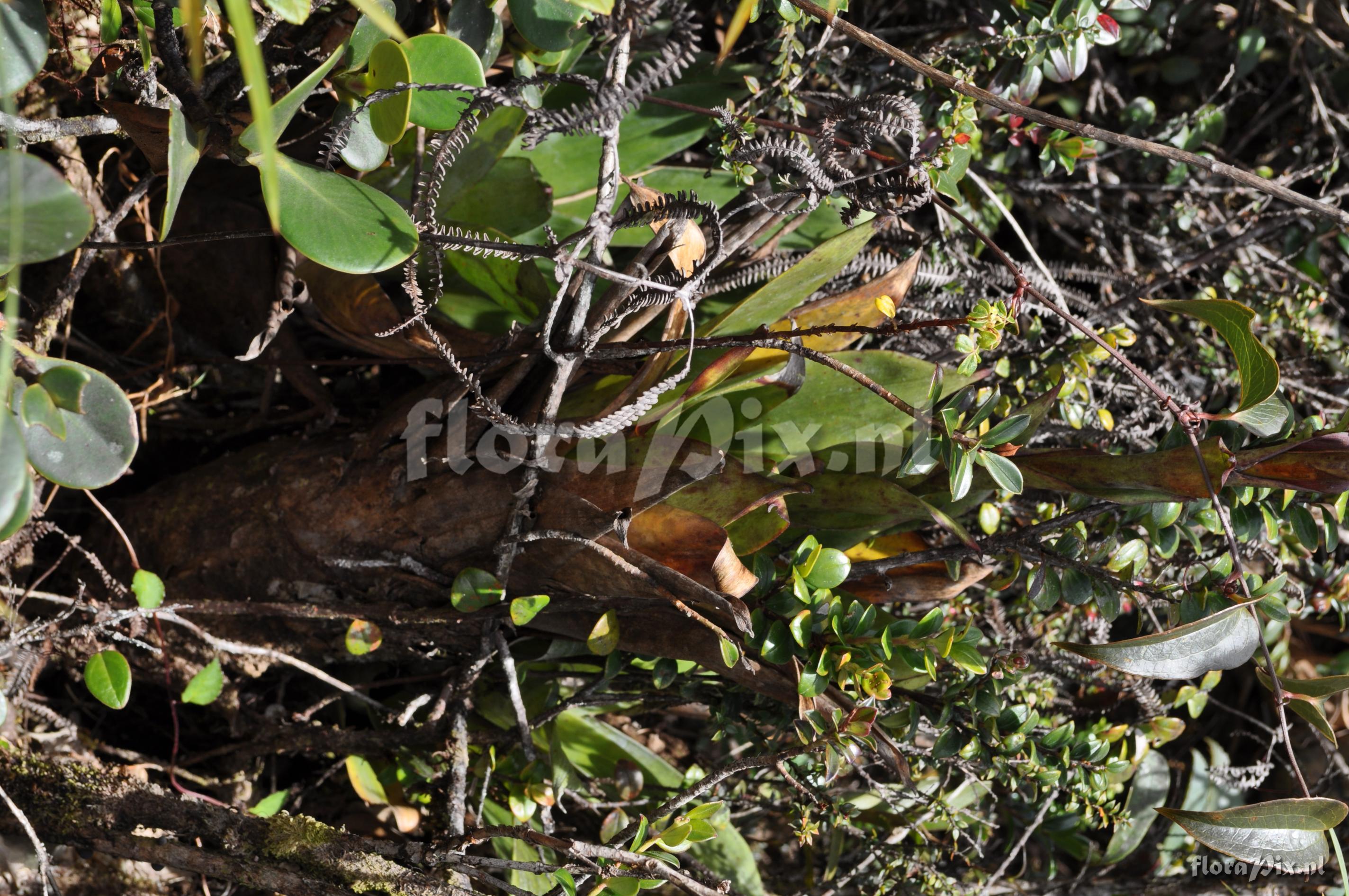 Locality: Ecuador - Prov. of Zamora-Chinchipe, area of Estación Cientifica San Francisco (S 03°58´, W 79°04´ ), road Loja-Zamora, ca. 35 km from Loja; moist montane forest Photographer: Florian Werner Note: Col.: Werner, F.A. 3115 (13-03-2011) "vegetatively a faint resemblance of T. fendleri but more erect, compact tank; blackish base of outer leaves, the glabrous abaxial leaf side also with conspicuous wax ; flower bracts compact, red, corolla light violet. Epiph. or terrestrial (in paramo)."
