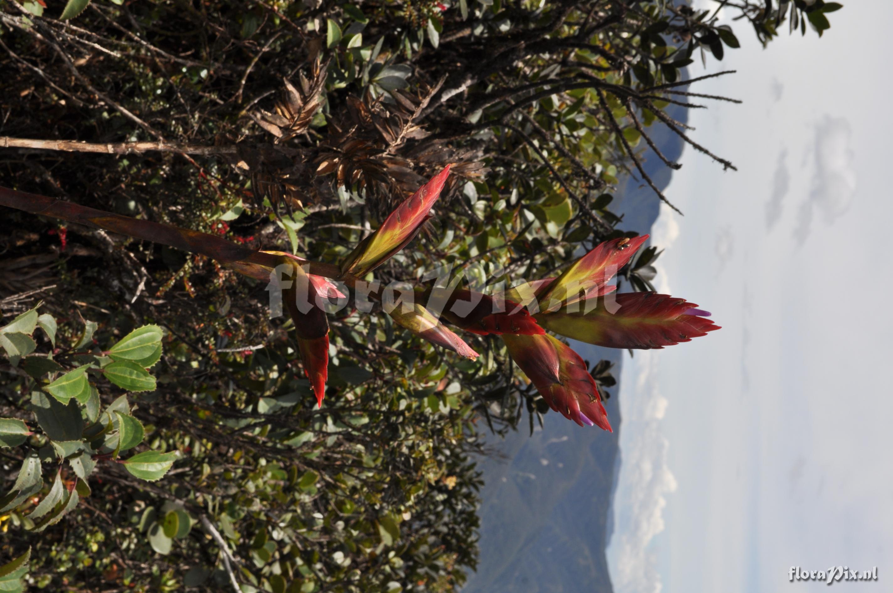 Locality: Ecuador - Prov. of Zamora-Chinchipe, area of Estación Cientifica San Francisco (S 03°58´, W 79°04´ ), road Loja-Zamora, ca. 35 km from Loja; moist montane forest Photographer: Florian Werner Note: Col.: Werner, F.A. 3115 (13-03-2011) "vegetatively a faint resemblance of T. fendleri but more erect, compact tank; blackish base of outer leaves, the glabrous abaxial leaf side also with conspicuous wax ; flower bracts compact, red, corolla light violet. Epiph. or terrestrial (in paramo)."