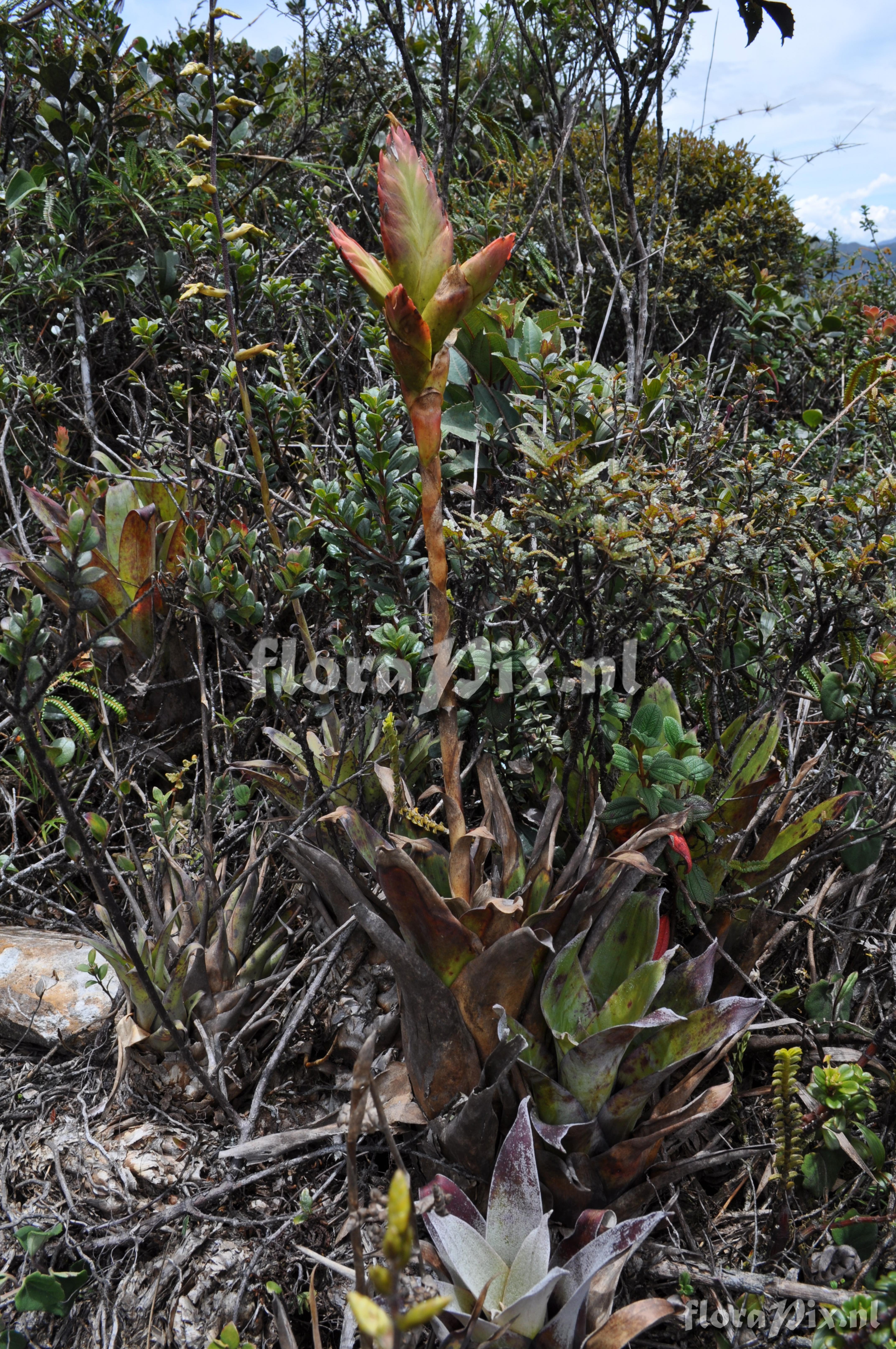 Locality: Ecuador - Prov. of Zamora-Chinchipe, area of Estación Cientifica San Francisco (S 03°58´, W 79°04´ ), road Loja-Zamora, ca. 35 km from Loja; moist montane forest Photographer: Florian Werner Note: Col.: Werner, F.A. 3115 (13-03-2011) "vegetatively a faint resemblance of T. fendleri but more erect, compact tank; blackish base of outer leaves, the glabrous abaxial leaf side also with conspicuous wax ; flower bracts compact, red, corolla light violet. Epiph. or terrestrial (in paramo)."