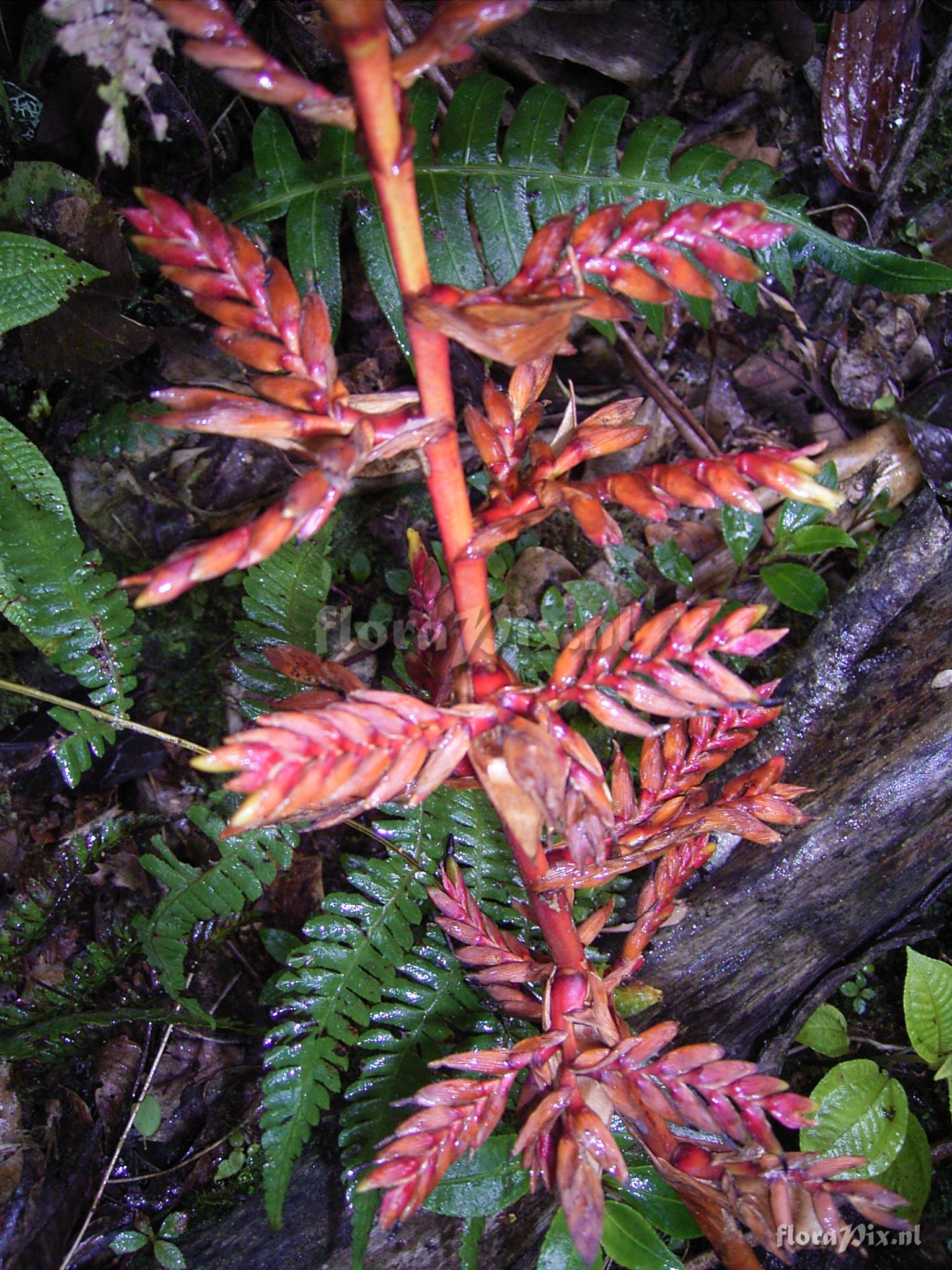 Locality: Ecuador - Prov. of Zamora-Chinchipe, area of Estación Cientifica San Francisco (S 03°58´, W 79°04´ ), road Loja-Zamora, ca. 35 km from Loja; moist montane forest Photographer: Florian Werner Note: Col.: Werner, F.A. 1811 (11-10-2005) - Det.: H. Luther (SEL) 2007 bracts red, corolla bright yellow. Common here in canopy and subcanopy, but absent from along adjacernt slopes and ridges.