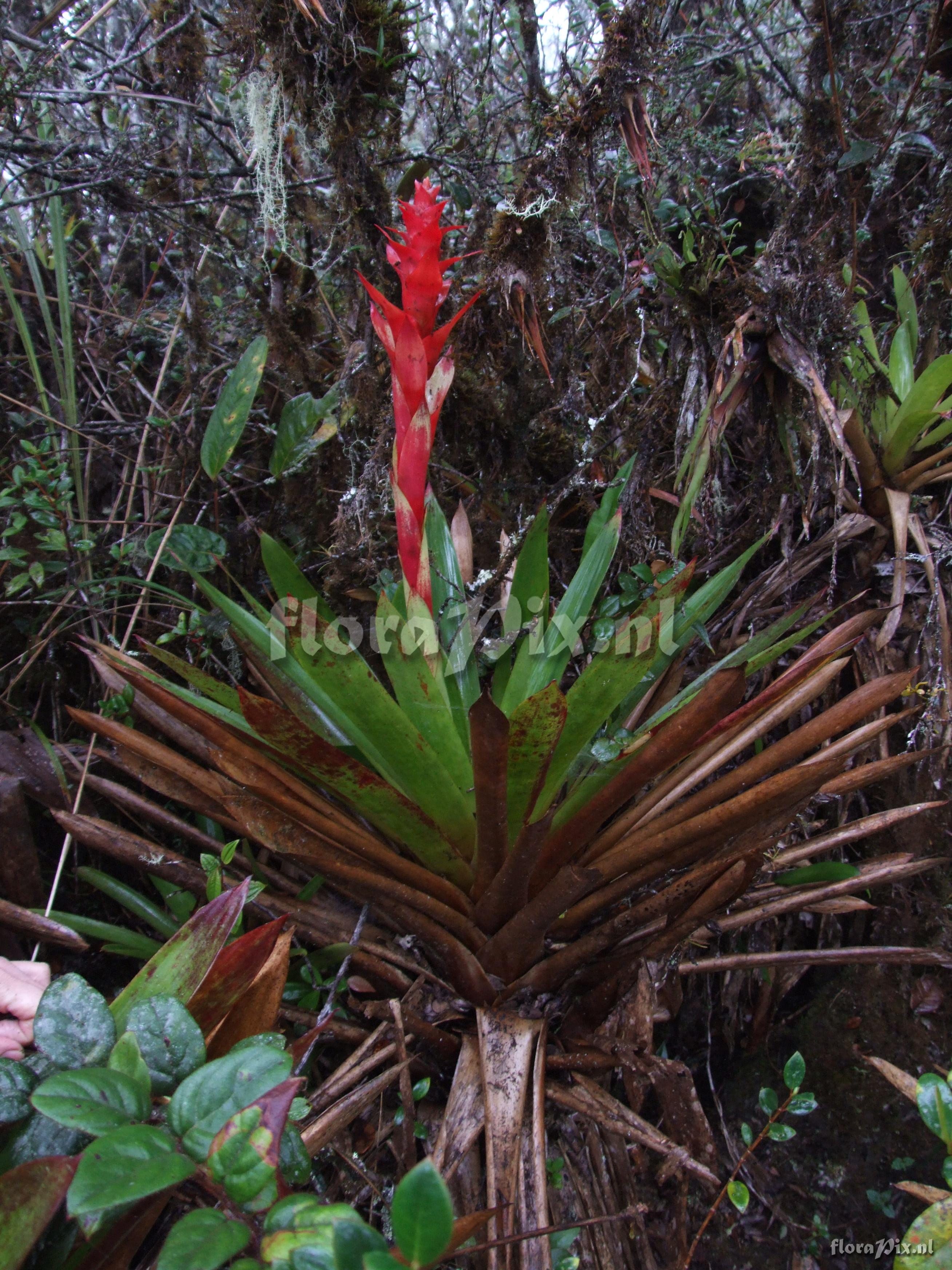 7696 - Bromeliads (Wild) - 2011-10-13(Dimension: 2646 x 3538 pixels - Counter: 9154) Guzmania variegata ![]() (Uploaded as: Guzmania ) Locality: Ecuador - Prov. of Zamora-Chinchipe, area of Estación Cientifica San Francisco (S 03°58“, W 79°04“ ), road Loja-Zamora, ca. 35 km from Loja; moist montane forest Photographer: Florian Werner Note: Col.: Werner, F.A. 1958 (23-04-2006) "common around 2500m; leaves thin and very brittle; bracts bright red, flowers white." Identification: Solved