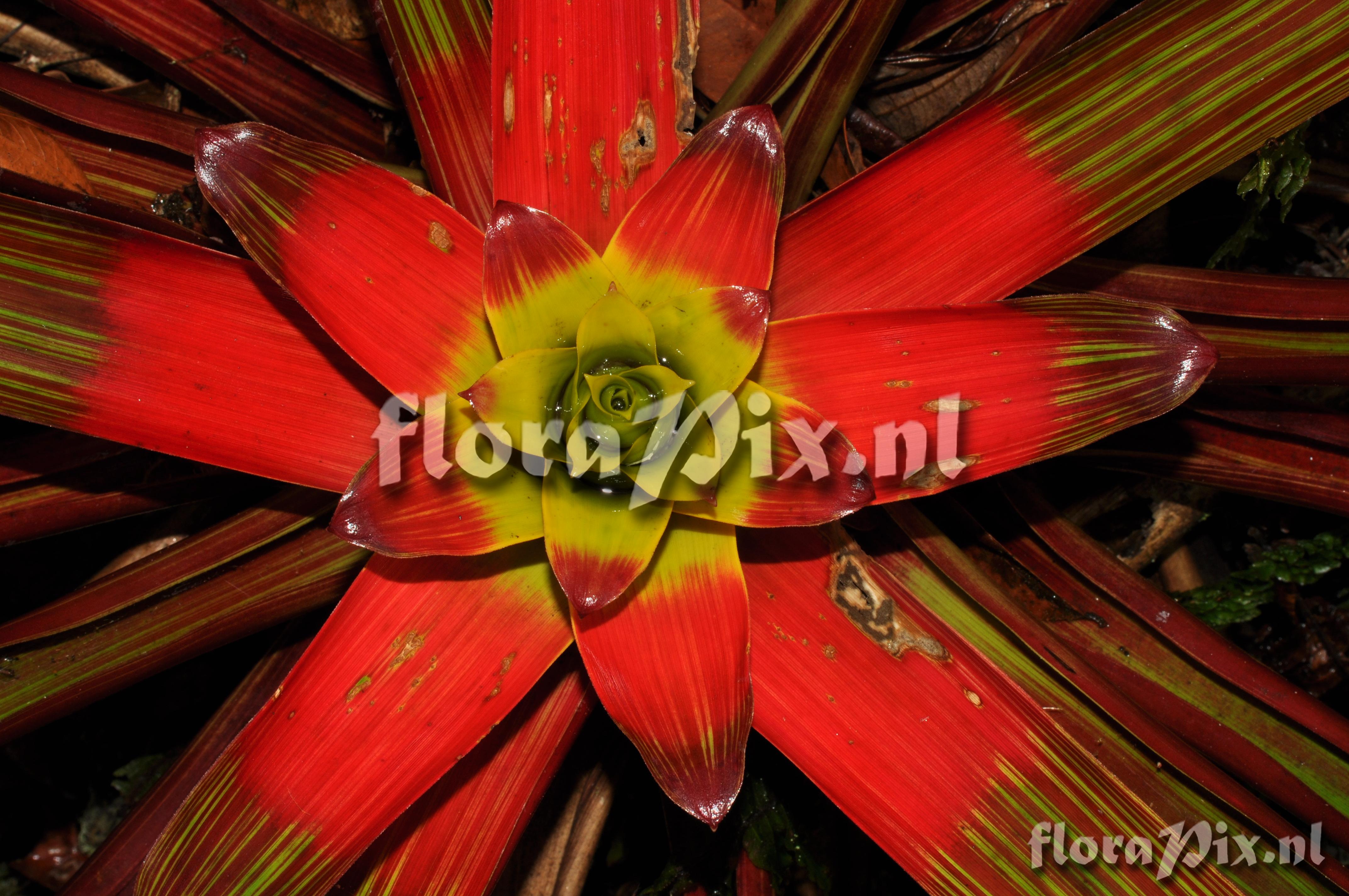 9109 - Bromeliads (Wild) - 2011-10-13(Dimension: 4318 x 2898 pixels - Counter: 9670) Guzmania squarrosa ![]() (Uploaded as: Guzmania ) Locality: Ecuador - Prov. Zamora-Chinchipe; close to Zamora; entrance of Podocarpus NP ""Bombuscaro"", tall premontane moist forest Photographer: Florian Werner Note: Col.: Werner, F.A. 3122 (08-04-2011) else often terrestrial in thick raw humus. Rather compact species that grows up into the midstorey. Unmistakable intense red leaf striping even in mature plants. Juveniles in their compactness resembling rather a Tillandsia. Flower-advertising bracts red or, in center, yellow. Identification: Solved