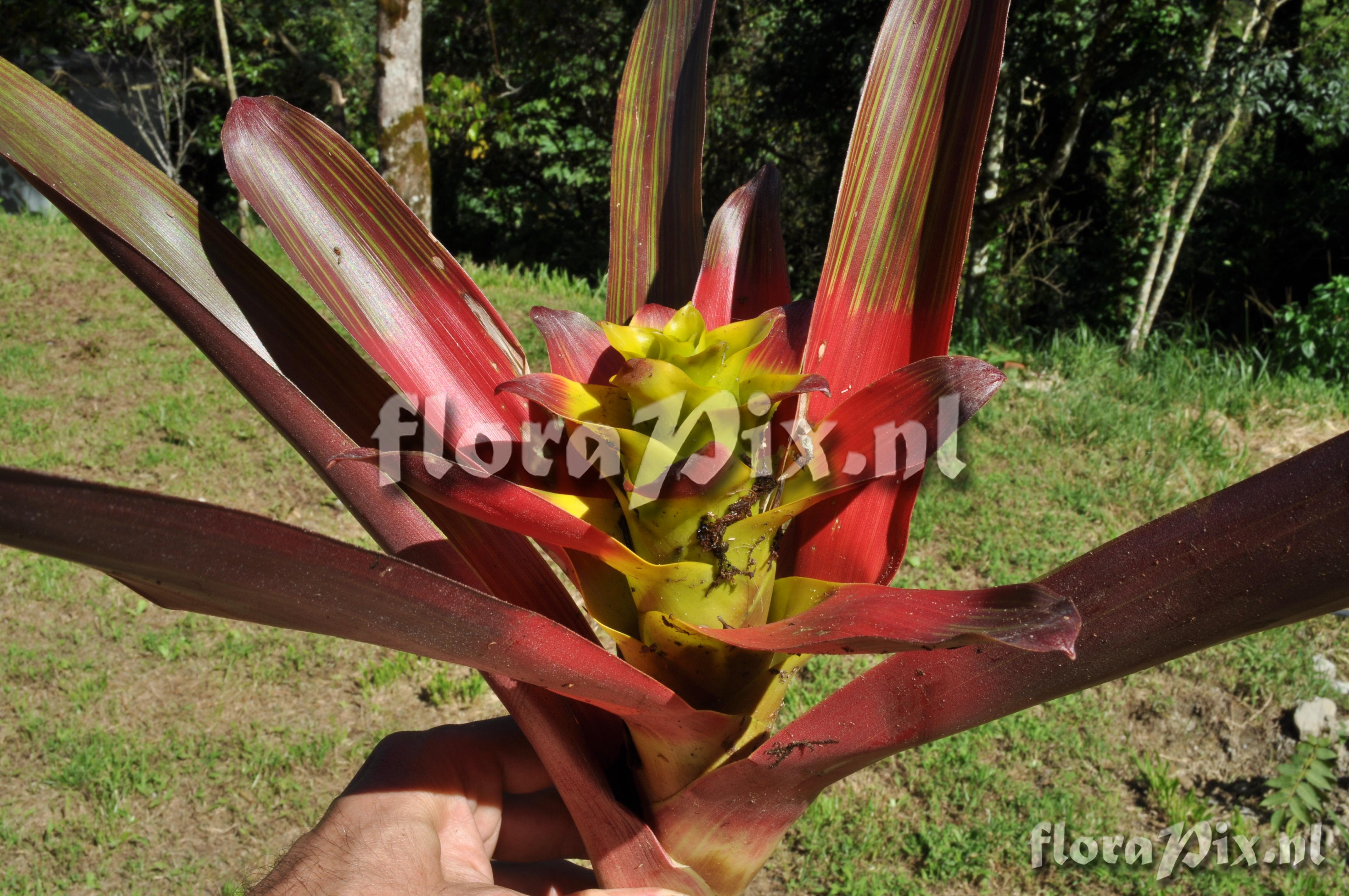 9154 - Bromeliads (Wild) - 2011-10-13(Dimension: 4318 x 2898 pixels - Counter: 9579) Guzmania squarrosa ![]() (Uploaded as: Guzmania ) Locality: Ecuador - Prov. Zamora-Chinchipe; close to Zamora; entrance of Podocarpus NP ""Bombuscaro"", tall premontane moist forest Photographer: Florian Werner Note: Col.: Werner, F.A. 3122 (08-04-2011) else often terrestrial in thick raw humus. Rather compact species that grows up into the midstorey. Unmistakable intense red leaf striping even in mature plants. Juveniles in their compactness resembling rather a Tillandsia. Flower-advertising bracts red or, in center, yellow. Identification: Solved