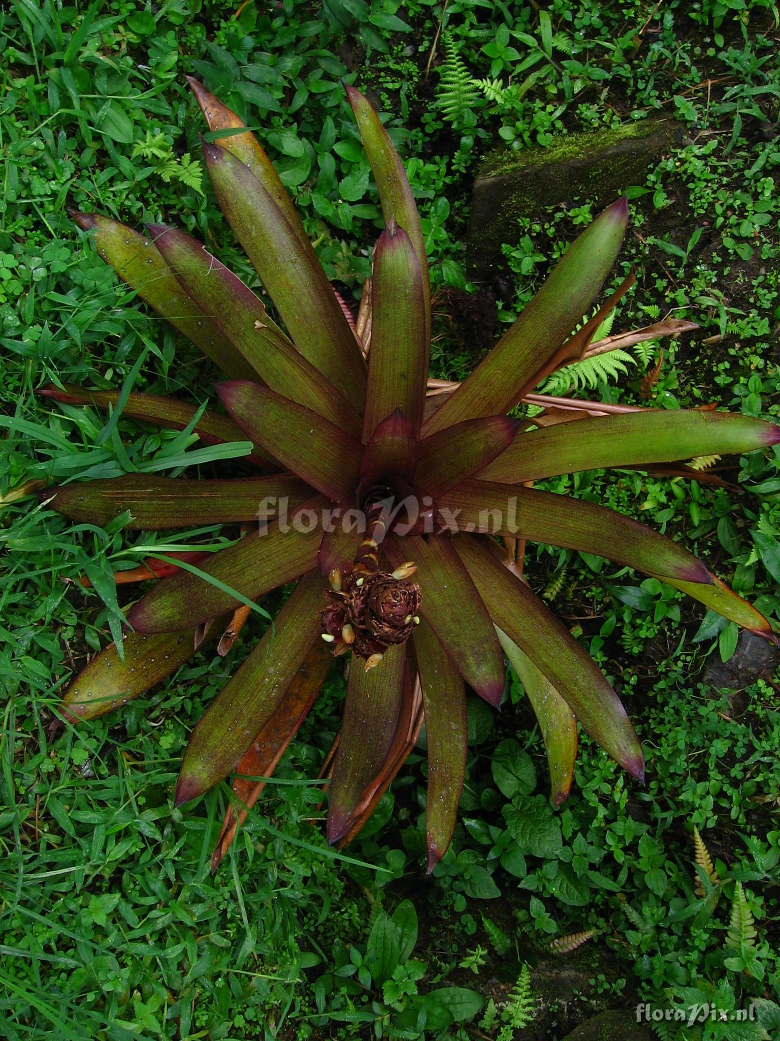9391 - Bromeliads (Wild) - 2011-10-13(Dimension: 1566 x 2098 pixels - Counter: 10468) Guzmania sp. nov. ![]() Locality: Ecuador - Prov. of Zamora-Chinchipe, area of Estación Cientifica San Francisco (S 03°58“, W 79°04“ ), road Loja-Zamora, ca. 35 km from Loja; moist montane forest Photographer: Florian Werner Note: Col.: Werner, F.A. 1997 (12-05-2006) - Det.: H. Luther (SEL) 2007 veins and crossveins of leaves bright red, giving a locally unique fine squared pattern. Uncommon. Petals wool-white, bracts essentially reddish-brown. Finally pressed (photos) 4.6.06.