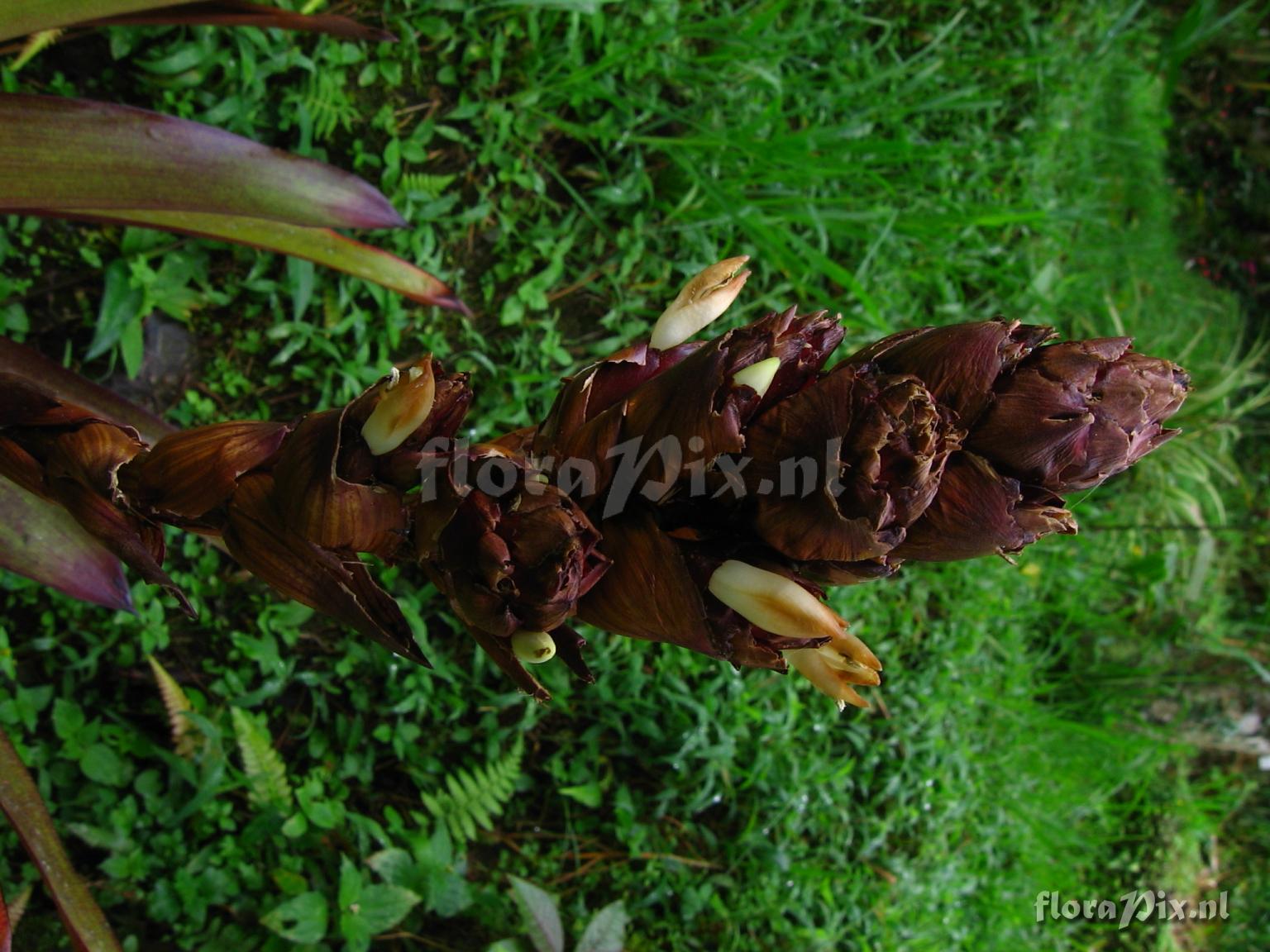 9392 - Bromeliads (Wild) - 2011-10-13(Dimension: 1566 x 2098 pixels - Counter: 10074) Guzmania sp. nov. ![]() Locality: Ecuador - Prov. of Zamora-Chinchipe, area of Estación Cientifica San Francisco (S 03°58“, W 79°04“ ), road Loja-Zamora, ca. 35 km from Loja; moist montane forest Photographer: Florian Werner Note: Col.: Werner, F.A. 1997 (12-05-2006) - Det.: H. Luther (SEL) 2007 veins and crossveins of leaves bright red, giving a locally unique fine squared pattern. Uncommon. Petals wool-white, bracts essentially reddish-brown. Finally pressed (photos) 4.6.06.