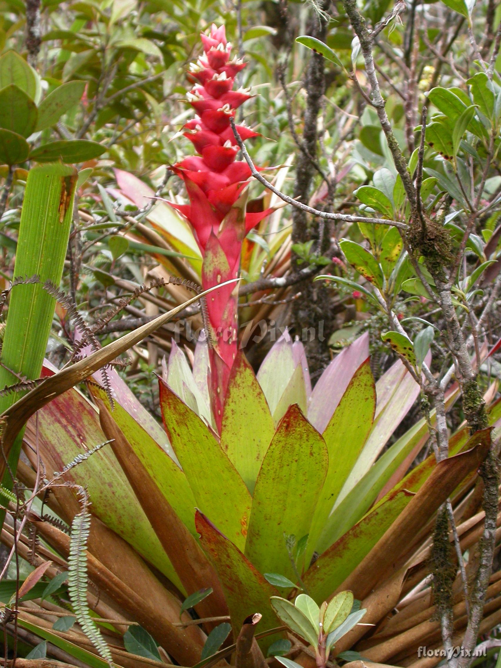 9241 - Bromeliads (Wild) - 2011-10-13(Dimension: 1734 x 2322 pixels - Counter: 8983) Mezobromelia cf. capituligera ![]() Locality: Ecuador - Prov. of Zamora-Chinchipe, area of Estación Cientifica San Francisco (S 03°58“, W 79°04“ ), road Loja-Zamora, ca. 35 km from Loja; moist montane forest Photographer: Florian Werner Note: (as Werner, F.A. 2058 ) - Det.: W. Till (U Vienna) 2011 "leaves fairly light green without markings; bracts bright pinkish red; flowering: petals white, slim tubular."