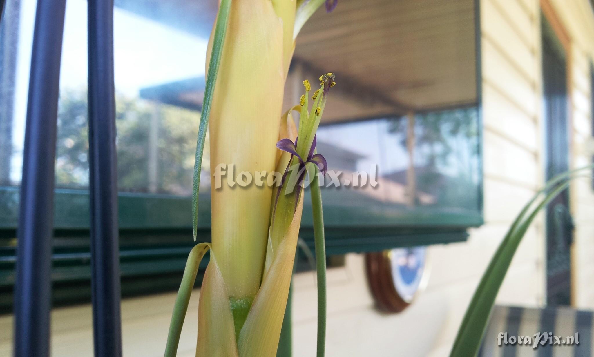 - Note (11341): Jerry Raack (2014-02-12) - Nice job posting the piece parts Peter. Who has done some study on this group of similar plants, does anyone know? When I compare pictures of this plant with what I posted and Eric identified as Tillandsia olmosana var pachamamae (Originally posted as Vriesia cylindrica), I'm hard pressed to see any significant differences other than color. Admittedly, I did not pull my inflorescence apart, but the closeup photos of the inflorescence and flowers sure look the same. I have another of my plants coming into bloom in a week or two, I'll pull it apart and do as you did with yours for comparison. Do you have some overall dimensions of your yellow form that you can post here (total height, width, length and width of leaves)? Does anyone in the USA have this plant and would like to trade me one for one of my T/V that I posted?