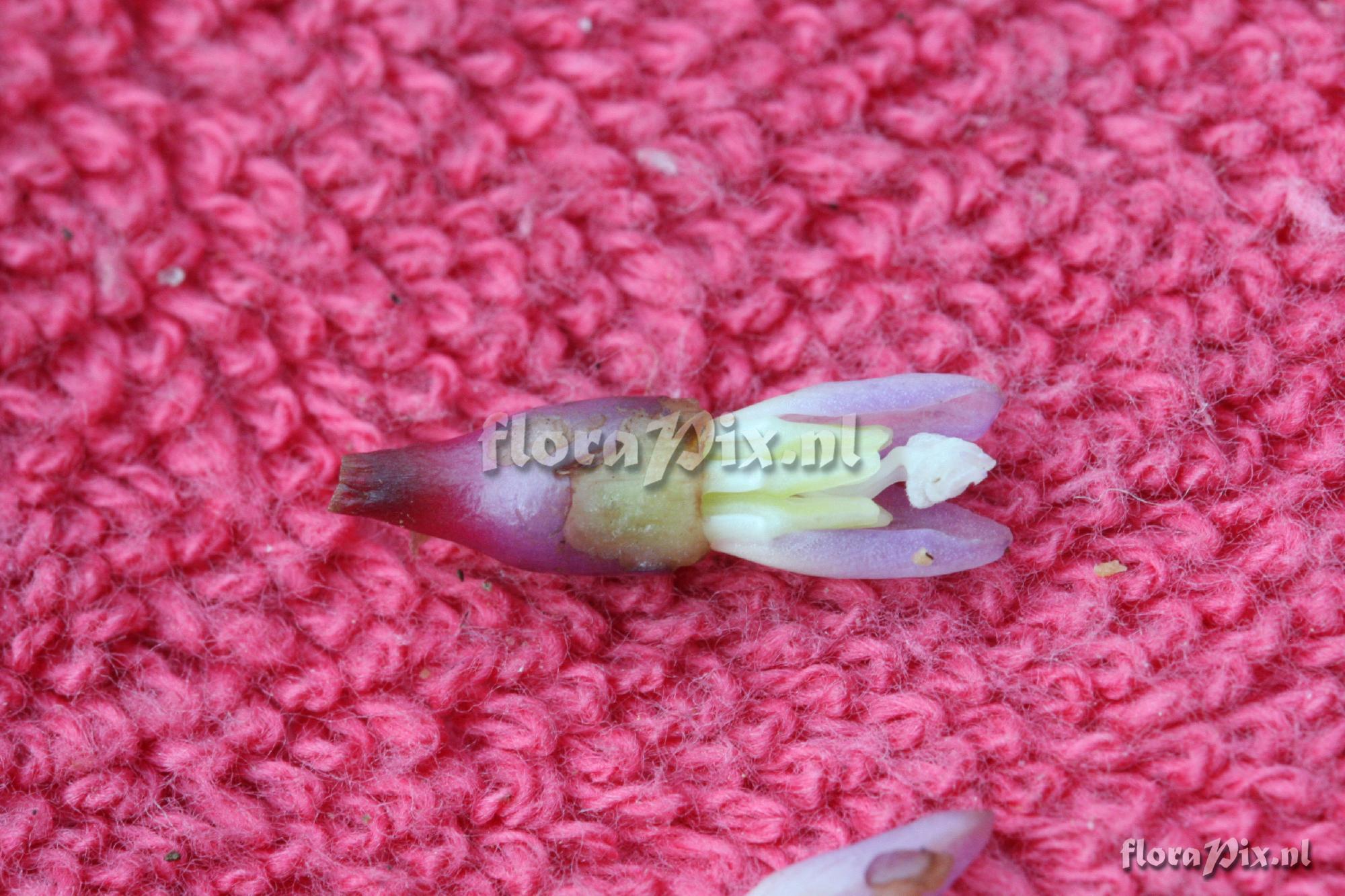 Opmerking: Undamaged, unopened flower removed from plant (image 6). Sepals were peeled back to show petals, pale purple at this stage, possibly darker when opened naturally; stamens white, unclear whether, under natural opening, these would be exserted. If so, the extent would be very slight.