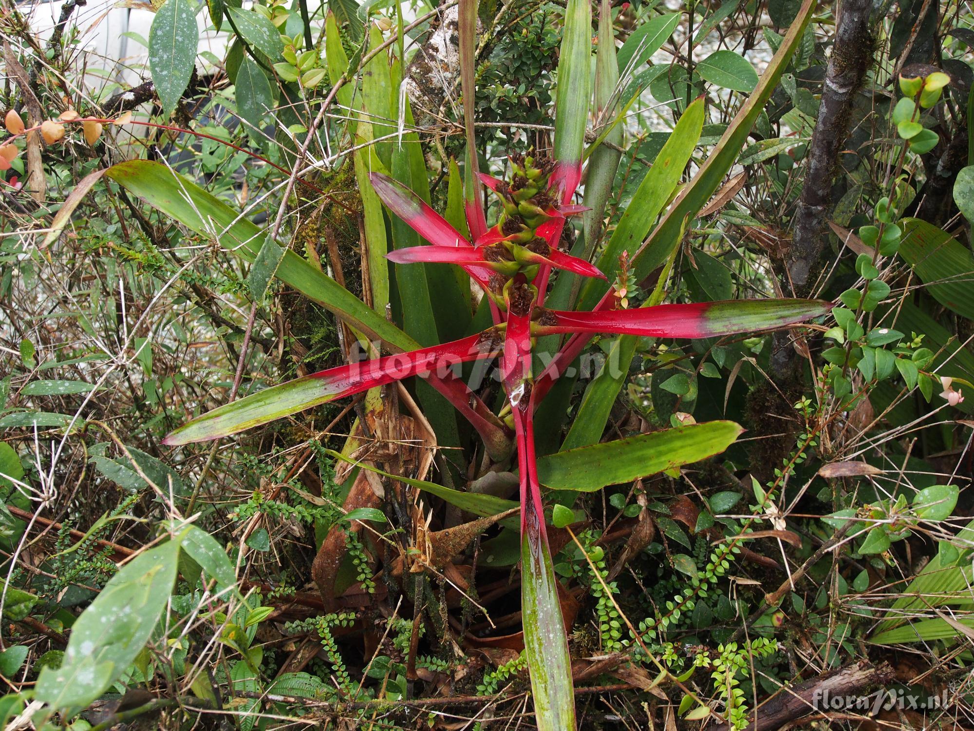 Verzamel locatie: Ecuador, Morona-Santiago Province - 4 km west of Highway 45 on road from Macas to Cuenca. Limon Antenna Road at 2284 meters. Fotograaf: Jerry Raack Opmerking: This is one of several Guzmania found at this high elevation, wet, windy location. They are difficult to identify positively at this location because they all grow together (G. mosquerae, G. aff squarrosa, Guzmania garciaensis and an unknown Guzmania), plus some hybrids between them I believe). In any event this beautiful Guzmania has long red bracts, and I believe it has white flowers. These plants grow as terrestrials in deep sphagnum moss under very wet conditions and can develop fairly long stolons as the new offset emerges typically from just off-center of the old inflorescence. (Verzonden: brom-l@science.uu.nl) Determinatie: gevraagd
