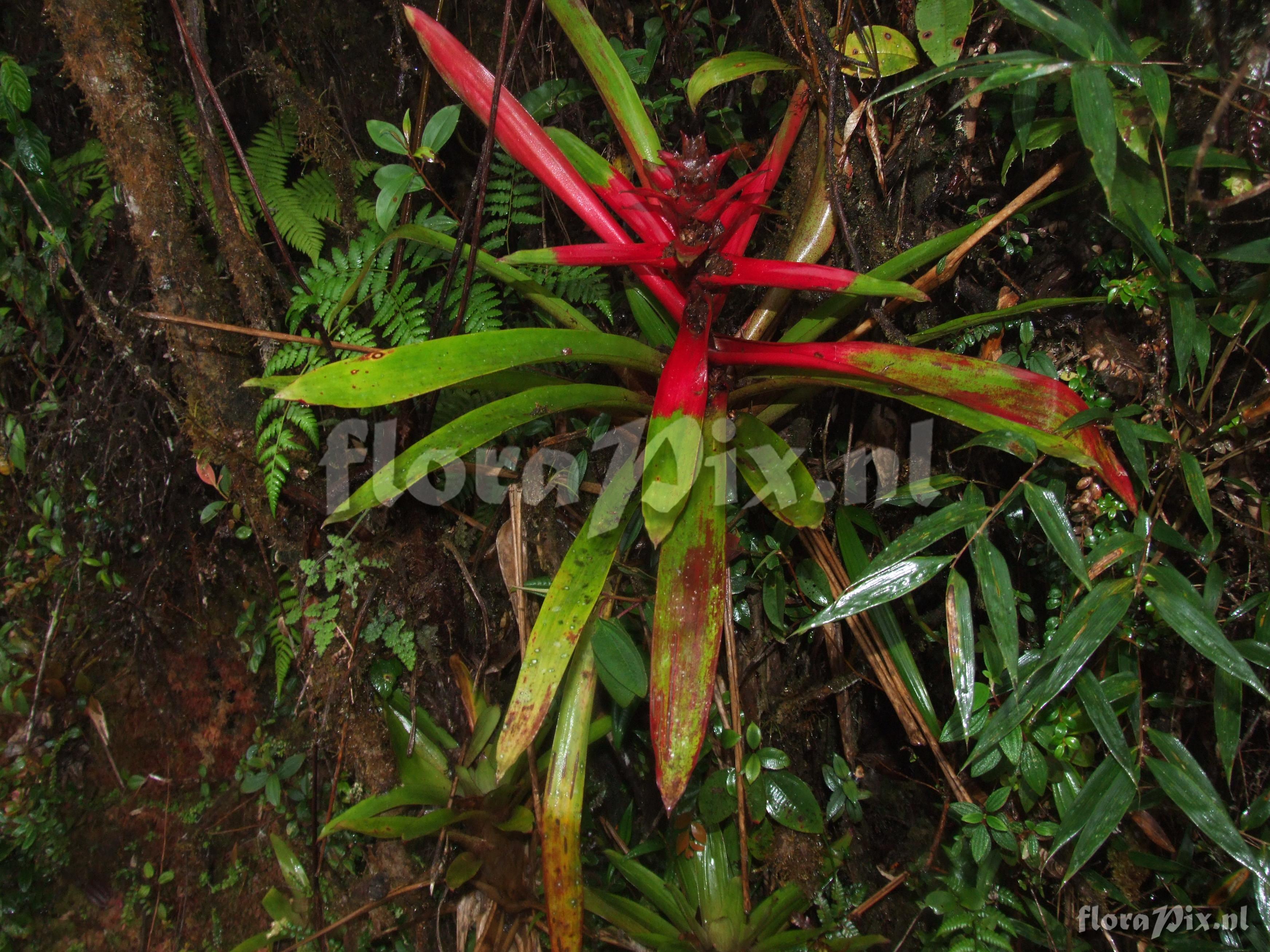 (Geladen als: Guzmania aff. sanguinea 2 ) Verzamel locatie: Ecuador - Prov. of Zamora-Chinchipe, area of Estación Cientifica San Francisco (S 03°58“, W 79°04“ ), road Loja-Zamora, ca. 35 km from Loja; moist montane forest Fotograaf: Florian Werner Opmerking: Col.: Werner, F.A. 1959 (23-04-2006) very much like G. sanguinea (fw1787) which grows at lower altitude and has yellow bract centers while THIS has red bract centers along with the yellow flowers. This species also has prominent fine red spotting on basal ca. third of leaves. Determinatie: Opgelost