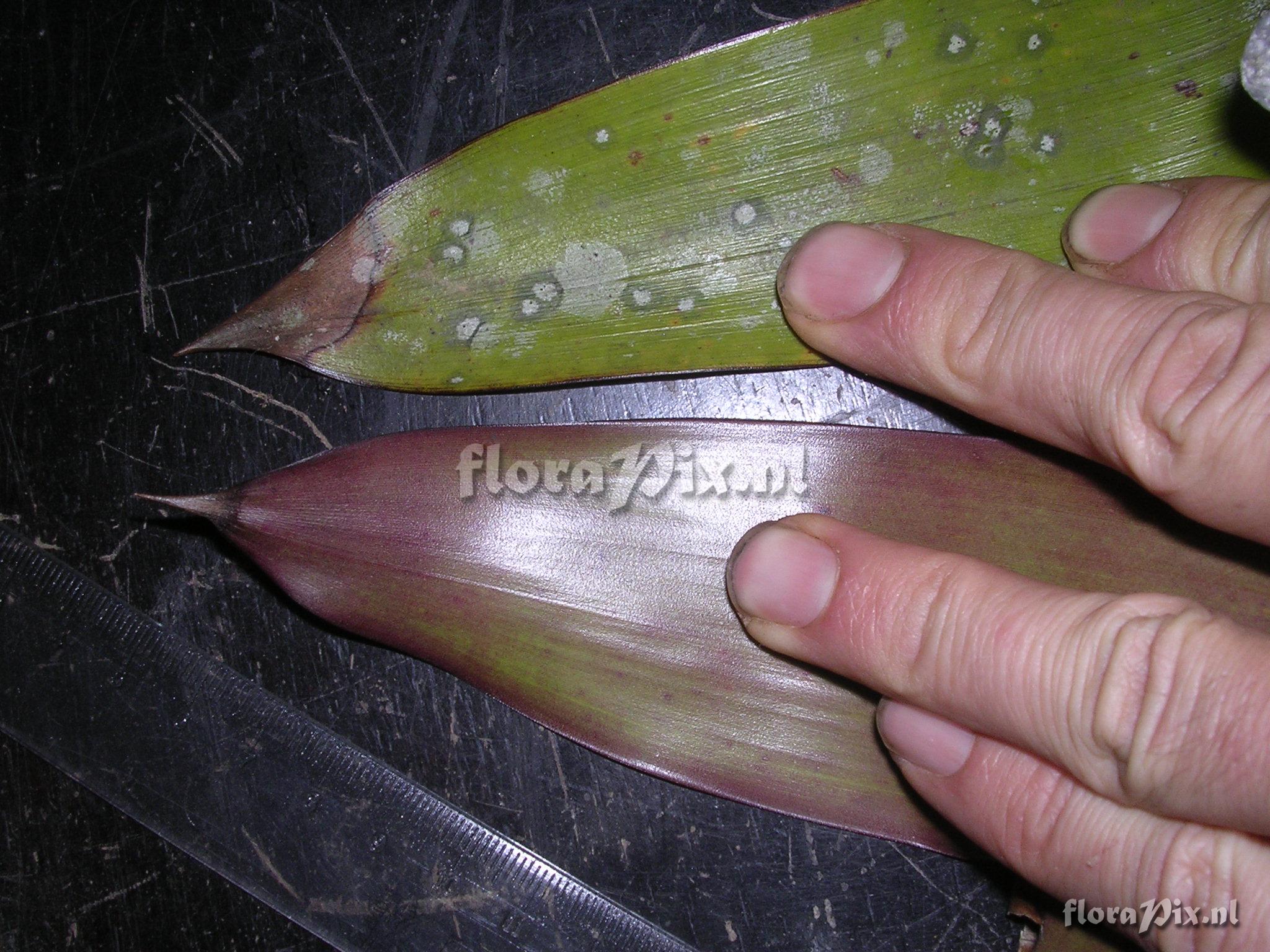 (Geladen als: Guzmania ) Verzamel locatie: Ecuador - Prov. of Zamora-Chinchipe, area of Estación Cientifica San Francisco (S 03°58“, W 79°04“ ), road Loja-Zamora, ca. 35 km from Loja; moist montane forest Fotograaf: Florian Werner Opmerking: Col.: Werner, F.A. 1782 (20-09-2005) "bracts along stalk (incl. those embracing the infl.) dirty purple or - simply - green (just as abaxial young leaves), bracts subduing flowers light red with yellow tips. Petals fleshy, wool-white; uncommon. Common (and larger) around 1000m, Bombuscaro." Determinatie: Opgelost