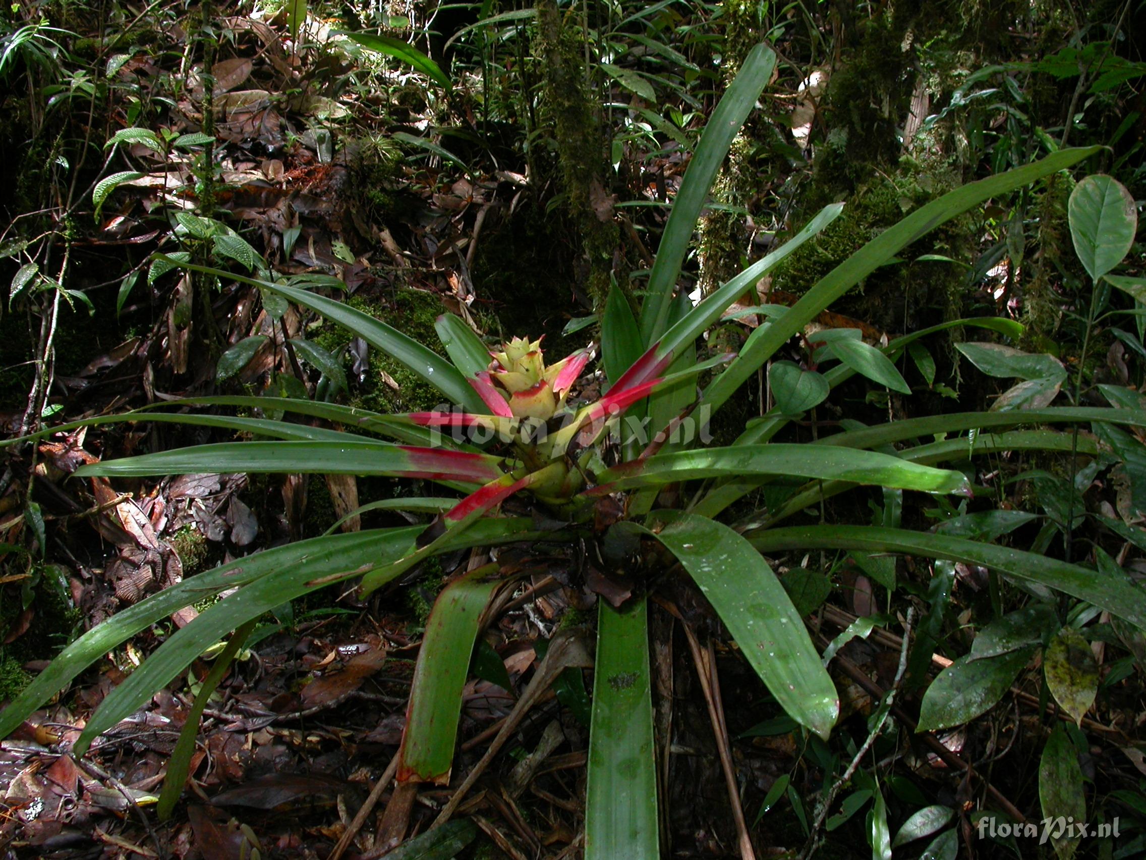 Verzamel locatie: Ecuador - Prov. of Zamora-Chinchipe, area of Estación Cientifica San Francisco (S 03°58“, W 79°04“ ), road Loja-Zamora, ca. 35 km from Loja; moist montane forest Fotograaf: Florian Werner Opmerking: (as Werner, F.A. 1787 ) - Det.: H. Luther (SEL) 2007 "bracts red or green distally, red mid-section and yellow center; flowers bright yellow."