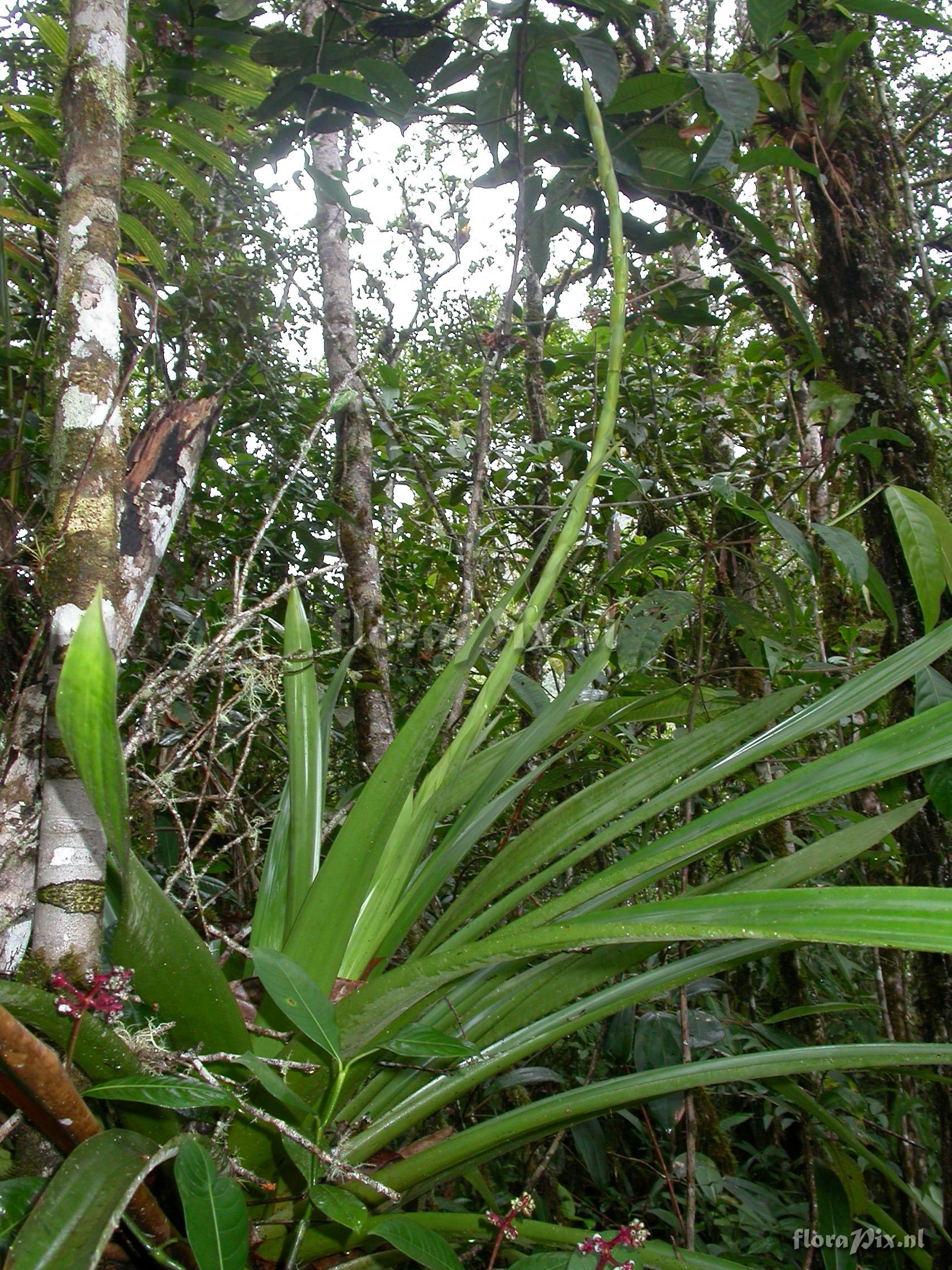 Verzamel locatie: Ecuador - Prov. Zamora-Chinchipe; close to Zamora; entrance of Podocarpus NP ""Bombuscaro"", tall premontane moist forest Fotograaf: Florian Werner Opmerking: (as Werner, F.A. 3118 ) infl. ca. 1.5 m long, straight, erect or inclided due to weight, with flowers along terminal 1/2-2/3. Largest (widest) local tank bromeliad. Aff. G. killipiana.