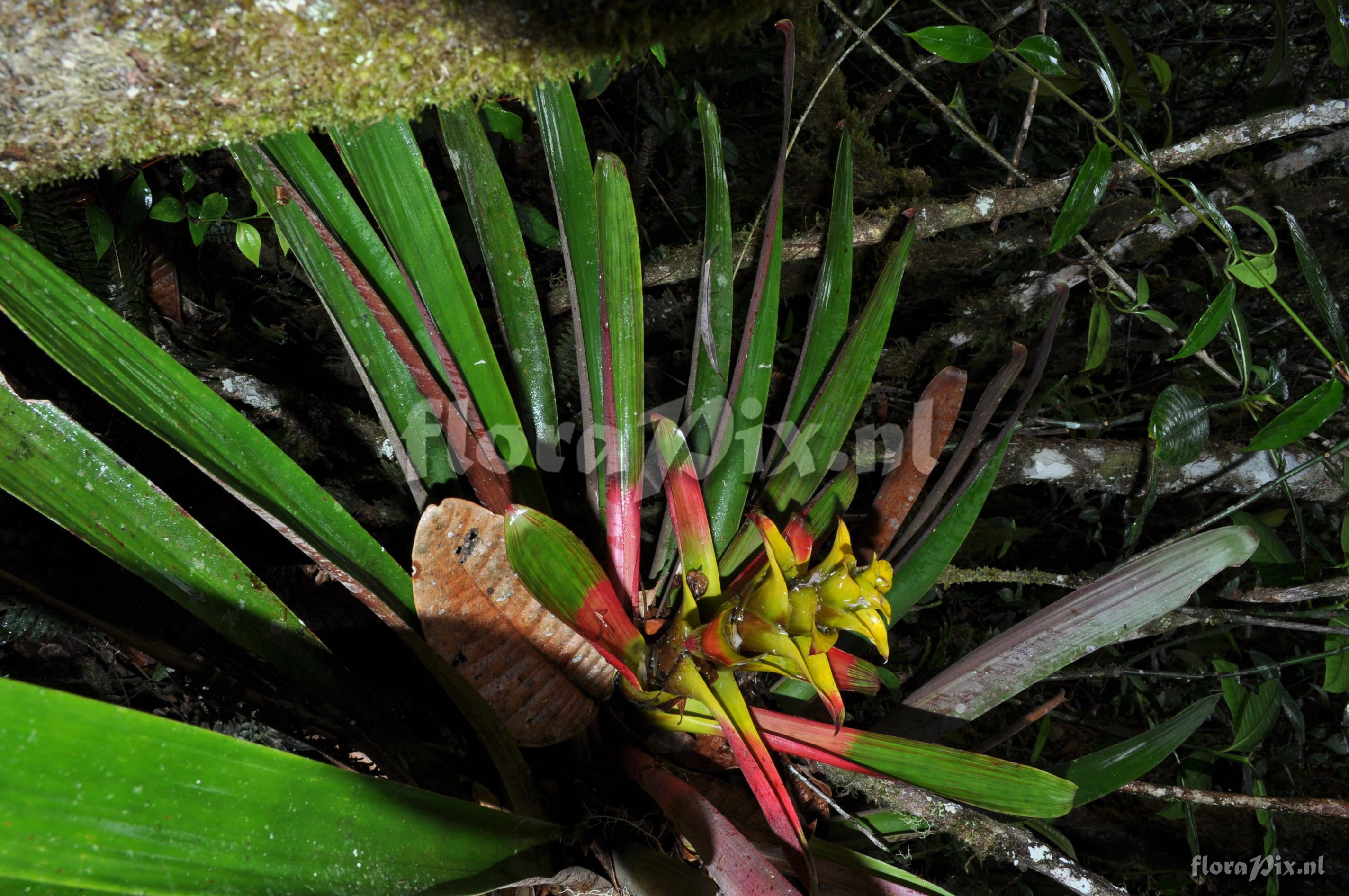 (Geladen als: Guzmania ) Verzamel locatie: Ecuador - Prov. Zamora-Chinchipe; close to Zamora; entrance of Podocarpus NP ""Bombuscaro"", tall premontane moist forest Fotograaf: Florian Werner Opmerking: Col.: Werner, F.A. 3122 (08-04-2011) else often terrestrial in thick raw humus. Rather compact species that grows up into the midstorey. Unmistakable intense red leaf striping even in mature plants. Juveniles in their compactness resembling rather a Tillandsia. Flower-advertising bracts red or, in center, yellow. Determinatie: Opgelost
