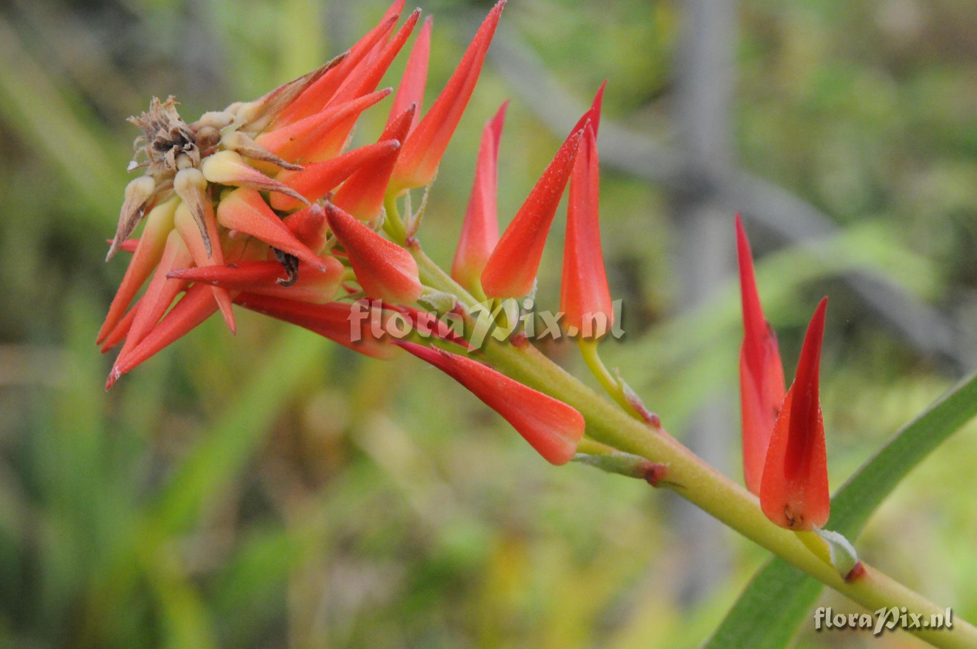 (Geladen als: Pitcairnia sp. (lehmannii?)) Verzamel locatie: Large Pitcairnia species from collector in Queensland. Origin unknown but probably grown from imported seed. About 1.5m or so tall. Somewhat rhizomatous - 30cm, with dense, recurved spines on the edges of the elongating sheaths which are very dark at the base (30cm+) (merge into narrowed, channelled leaves. until blade starts then entire). Could it be Pit. lehmannii? Fotograaf: Peter Tristram Determinatie: Opgelost