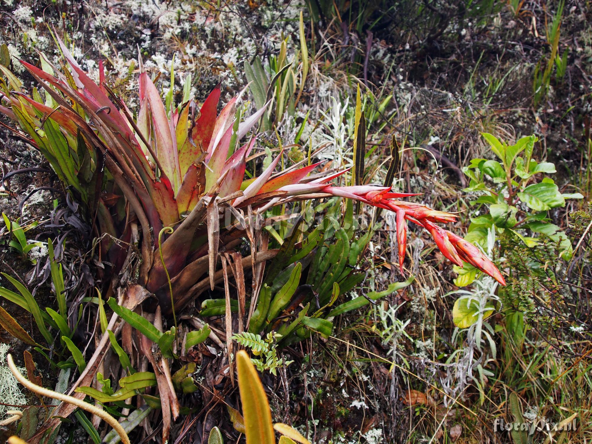 Verzamel locatie: Ecuador, Loja Province - Saraguro Antenna Road, Elevation 3003 meters Fotograaf: Jerry Raack Opmerking: Eric, Here is another image of one pre-anthesis. These plants were about 60 to 70 cm tall with inflorescence. Comparing them to the description of T. confinis matches them really closely. They are so much larger than the form I submitted earlier (#13705), that I hadn't considered they also might be T. confinis. I also was going by what you had told me for photos we took in June 2015 when we saw this plant at the same location. There were many of them coming into bloom this time at this location. They have very long lower primary bracts which are indeed are caudate and the upper apiculate. I would go with T. confinis as the ID for this plant. Too bad there were no flowers open as that would have helped ID it. (Verzonden: brom-l@science.uu.nl) Determinatie: in behandeling