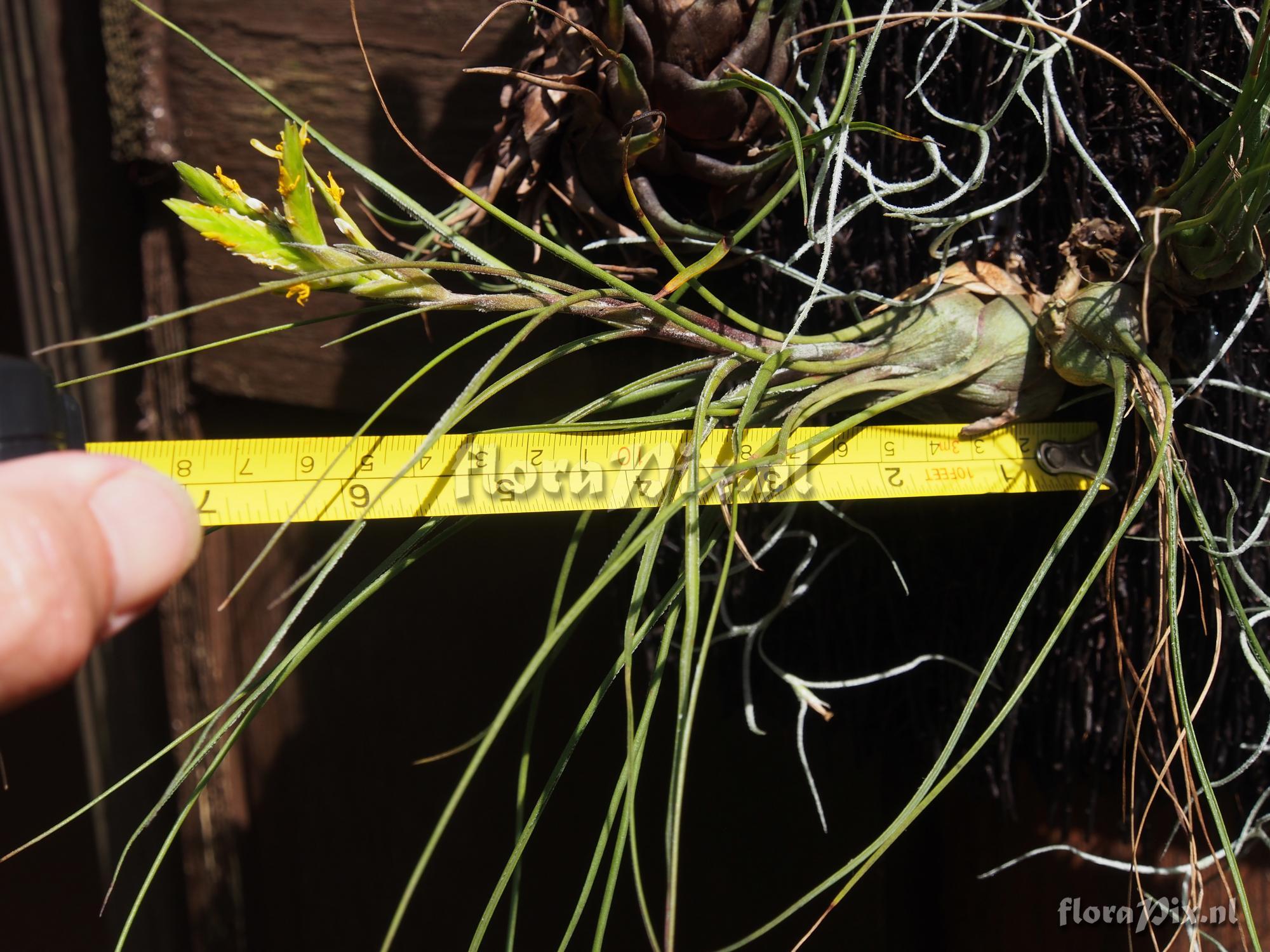 (Geladen als: Racinaea species) Verzamel locatie: Ecuador - Unknown - I purchased this from Gilberto Merino in 2017, and it just came into flower in my greenhouse. I need help identifying it. Leaves are 25 cm long (longest). Inflorescence 15 cm long, with 5 spikes clustered at the end. Each spike is 2.4 to 3.0 cm long and 6 mm wide. Flower bracts are 11 mm long. Petals (visible part) are 8 mm long and 2 mm wide. Any ideas? Large flowers for such a small Racinaea, or is it a Tillandsia? Fotograaf: Jerry Raack Determinatie: Opgelost