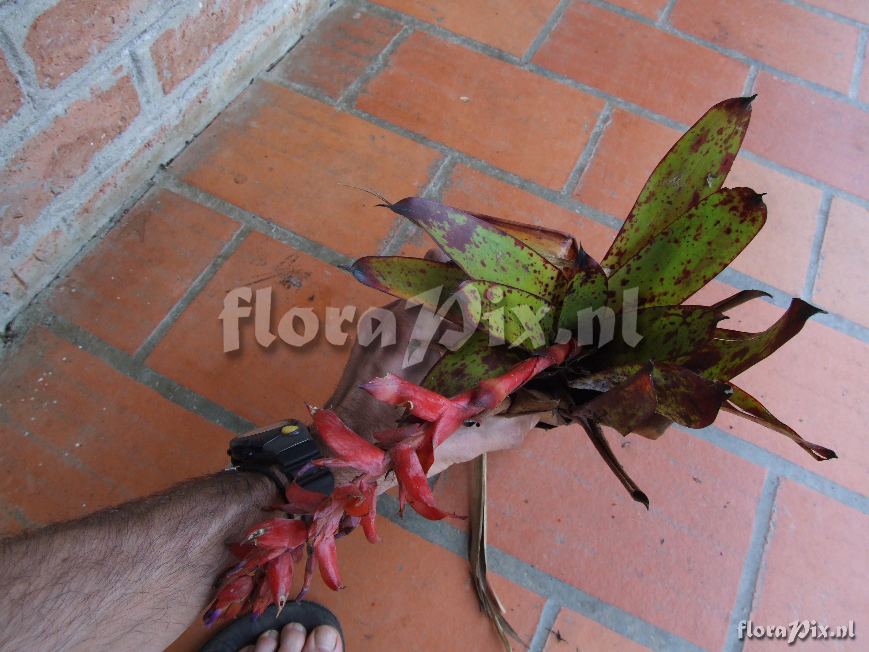 (Geladen als: Tillandsia compacta Griseb.-) Verzamel locatie: Ecuador - Prov. of Zamora-Chinchipe, area of Estación Cientifica San Francisco (S 03°58´, W 79°04´ ), road Loja-Zamora, ca. 35 km from Loja; moist montane forest Fotograaf: Florian Werner Opmerking: Col.: Werner, F.A. 1963 (23-04-2006) - Det.: H. Luther (SEL) 2007 "leaf undersides waxy; leaves forming an erect vase with central tank; semi-pendant infl.: bracts bright red, petals intense lila." Determinatie: Opgelost