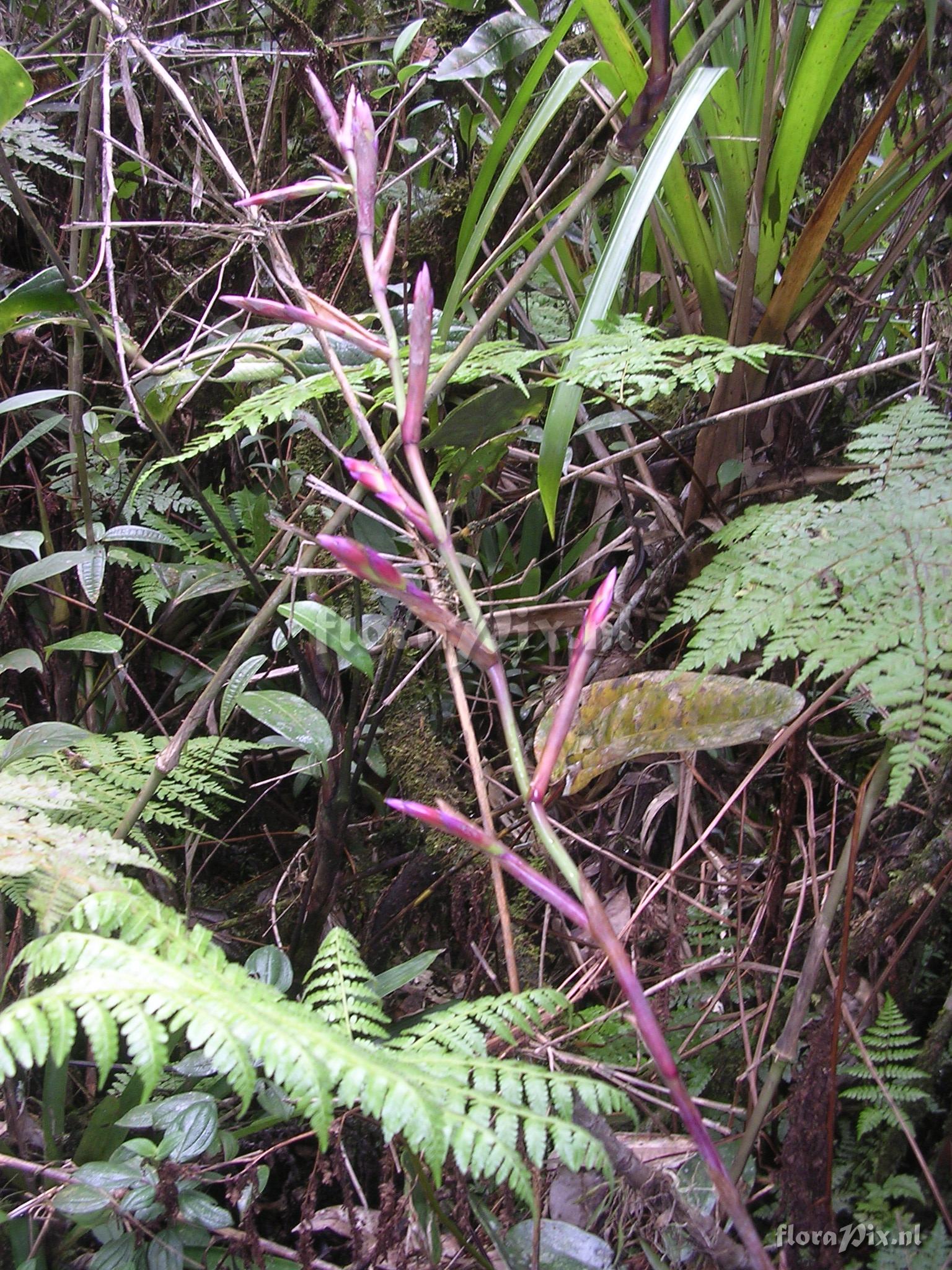 Verzamel locatie: Ecuador - Prov. of Zamora-Chinchipe, area of Estación Cientifica San Francisco (S 03°58´, W 79°04´ ), road Loja-Zamora, ca. 35 km from Loja; moist montane forest Fotograaf: Florian Werner Opmerking: Col.: Werner, F.A. 1593 (16-06-2005) - Det.: J.M. Manzanares "fallen with branch; flower bracts greenish yellow basally, than fadimng through bright red into (bluish) purple. Usually epiphytic and more compact."
