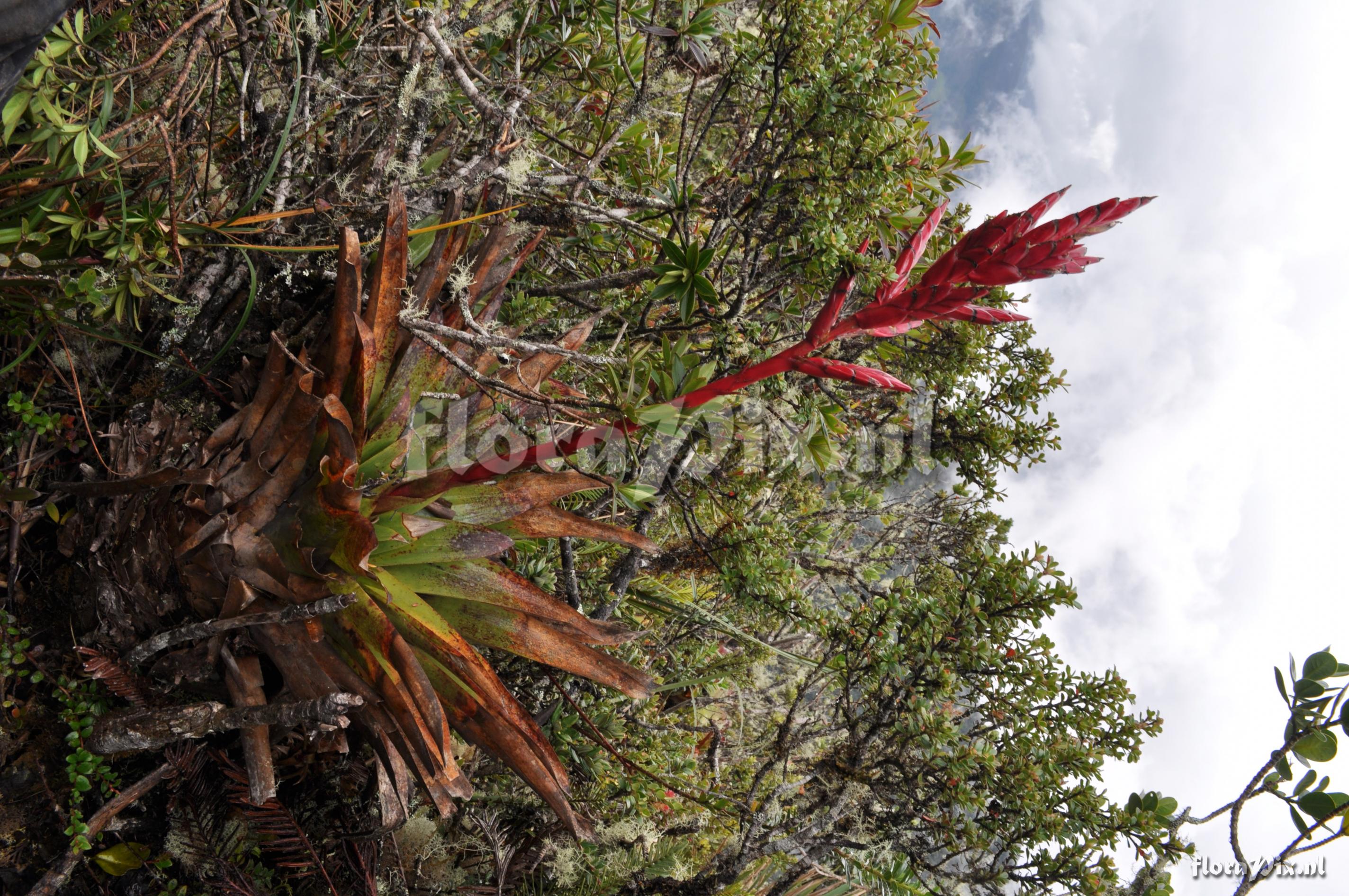 Verzamel locatie: Ecuador - Province of Loja, Parque Nacional Podocarpus, Cajanuma Fotograaf: Florian Werner Opmerking: Col.: Werner, F.A. 3123 (09-04-2011) - Det.: F.A. Werner plant terrestrial, but more commonly seen epiphytic. Deep, high storage-capacity- tank. Leaves consp. waxy abaxially, tips spiky-acute. Pedicel & bracts intense purplish dark red, flowers purple apparently (según Nelson). CF. fw3115!