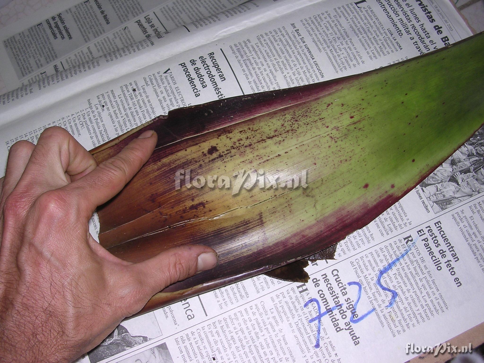 Verzamel locatie: Ecuador - Prov. of Zamora-Chinchipe, area of Estación Cientifica San Francisco (S 03°58´, W 79°04´ ), road Loja-Zamora, ca. 35 km from Loja; moist montane forest Fotograaf: Florian Werner Opmerking: Col.: Werner, F.A. 726 (27-12-2003) "Big, wide fucker. Common in canopy above Sabanilla but not noticed at ECSF forest. Likes it wet? Erect and branched infl. c. 1.5 m long and (in old state) superficially resembling Till. tovariensis. Leaves yellowish green with violet-red tips. Observed in flower 14.1.04: flowers cf. Guzm. large and white; 1st and 2nd degree flower stalk plus bracts on them bright red; 3rd deg. stalks with all borne parts white."