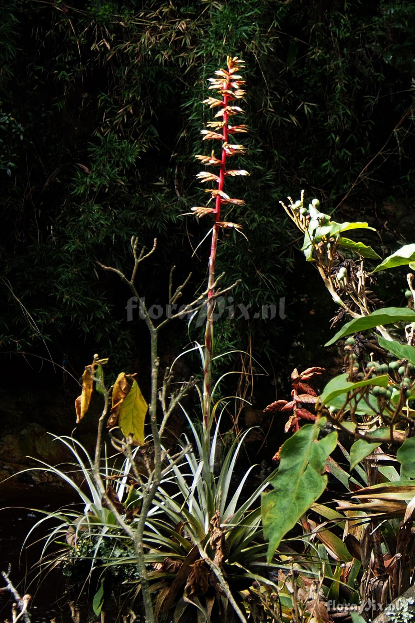 Verzamel locatie: Ecuador, Azuay Province - Not far from Banos (Cuenca) on road to Soldados at an elevation of 2800 meters. Also the last picture of one with seed pods is from 2900 meters 6.5 km south of Cumbe on Hwy 35 growing as a terrestrial on a rock hillside. Fotograaf: Jerry Raack Opmerking: This species appears from pictures posted elsewhere on Flora-Pix to be extremely variable. The only form I have seen in Ecuador is depicted in these photos. A very attractive small to medium species. Note near Banos, this plant grows on Eucalyptus trees along the banks of the Rio Yanuncay. Growing along with it on these trees is Racinaea pugiformis and Tillandsia walteri. My experience has been that Eucalyptus make an extremely poor host for epiphytes. Also note that the 23 spikes with their primary bracts in the first picture appear to be yellow, but that is not true, they are a light brown having already dried in the sun, and they have seed pods. The spikes are really yellowish red with red bracts before and during anthesis. I have no pictures of the flowers to include here but they should be bright purple. Also note that the description in the Encylopedia says that even the lower primary bracts are shorter than the spikes, but that is not true in the first 2 pictures I have included here where the bracts exceed the spikes on the lower portion. (Verzonden: brom-l@science.uu.nl) Determinatie: Opgelost